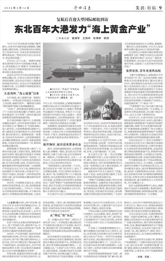 2023年,中国邮轮业逐步走上新冠疫情后的复苏轨道。在上海、深圳邮轮港口试点恢复的基础上,当年9月,中国宣布全面恢复国际邮轮运输,不少城市快速反应,积极推进国际邮轮复航。大连也不甘人后。早在疫情前,辽港集团就颇有前瞻性地启动15万吨邮轮泊位建设工程,并在去年对邮轮中心候船厅等软硬件设施进行升级改造。华程天下(大连)国际旅行社有限公司是大连最大一家国际邮轮地接社,总经理张淑秋说:“前几年国际邮轮业务虽然停了,但我们勒紧裤带,与海外的业务联系从未间断。”