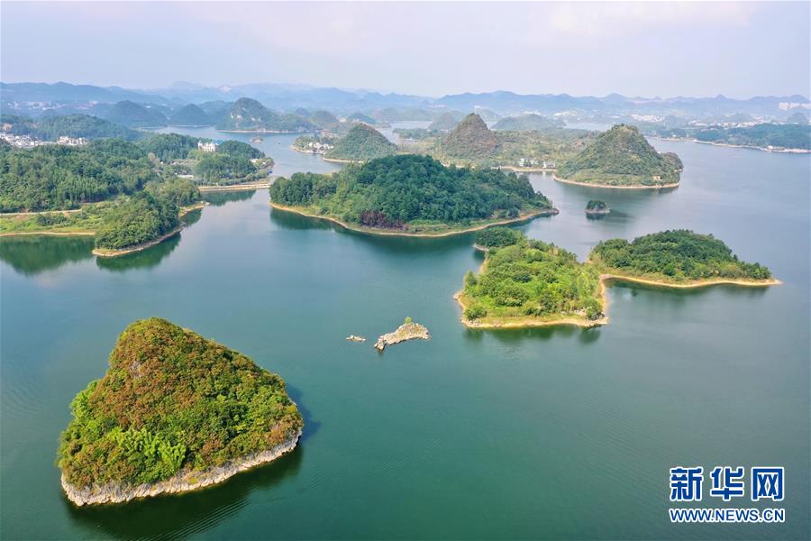 8月31日拍摄的百花湖风光(无人机照片)。 秋日时节,贵阳市百花湖百余个岛屿峰峦起伏,呈现出一幅美丽画卷。 新华社记者 刘续 摄