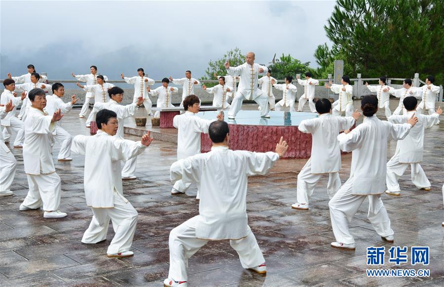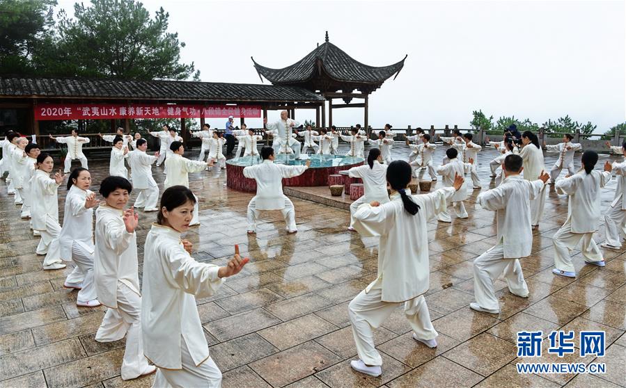 9月16日,健身爱好者在武夷山齐云峰景区表演健身气功八段锦。 近年来,福建省武夷山市充分依托优美的自然风光和良好的生态环境,大力实施“旅游+”“+旅游”战略,促进茶旅、文旅、体旅、康旅、展旅融合,推动旅游经济的发展。 新华社发(陈颖 摄)
