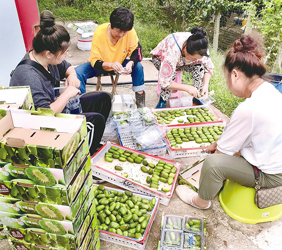 振安区五龙背镇推进小浆果种植,并帮助农户与企业联动,提高果农收益。图为9月17日,孙家村村民孙俊奎家的果园里,大家正将软枣猕猴桃装箱发往全国各地。记者 宋永昆 摄