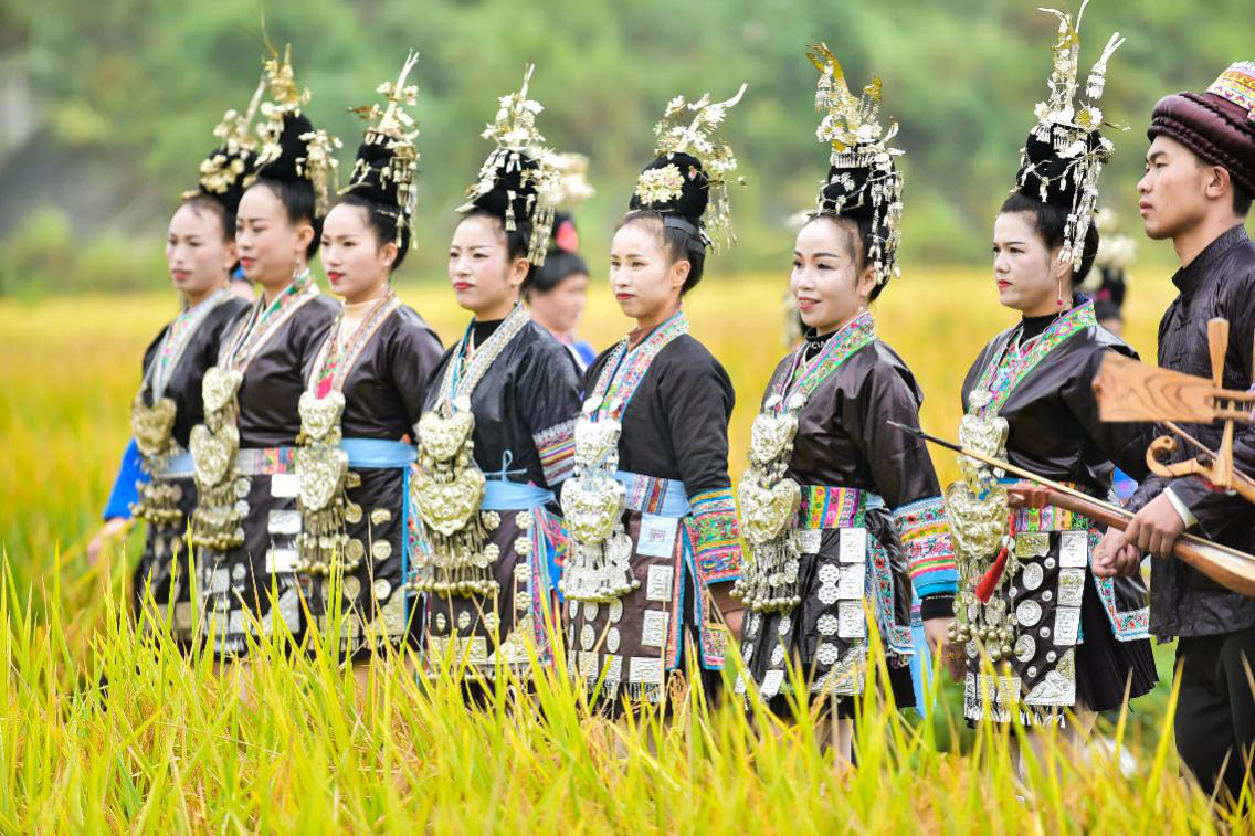 今年的丰收大典在紧邻丹寨万达小镇的丹寨县龙泉镇卡拉村举行。上午11时,丹寨苗族八大支系的村民们载歌载舞,欢聚在卡拉村,他们的身后是金色的田野、翻滚的稻浪,一派丰收景象。