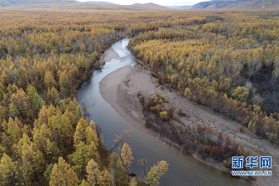 这是9月22日拍摄的奥克里堆山脚下的河流与森林(无人机照片)。 奥克里堆山位于内蒙古自治区呼伦贝尔市根河市。金秋时节,奥克里堆山的森林换上“秋装”,景色如画。 新华社记者 赵泽辉 摄