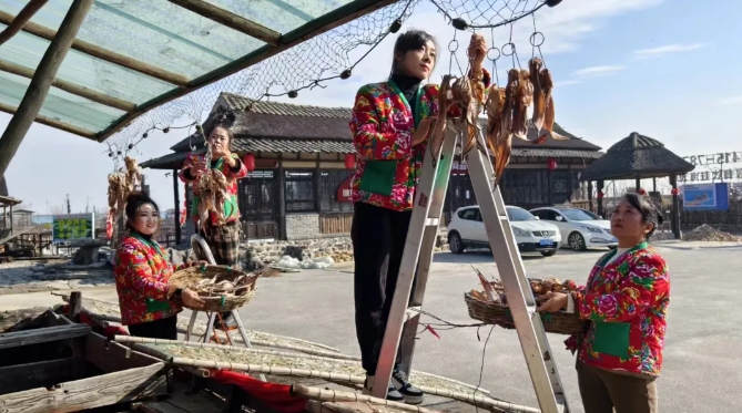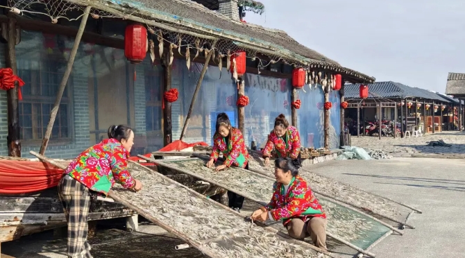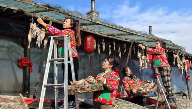 渔民们忙着挑鱼、洗鱼、抹盐、铺晒一排排胖头鱼、沙丁鱼、鲅鱼整齐排列海风吹过阵阵咸香味扑面而来