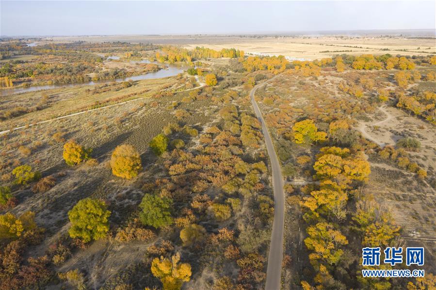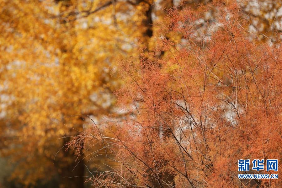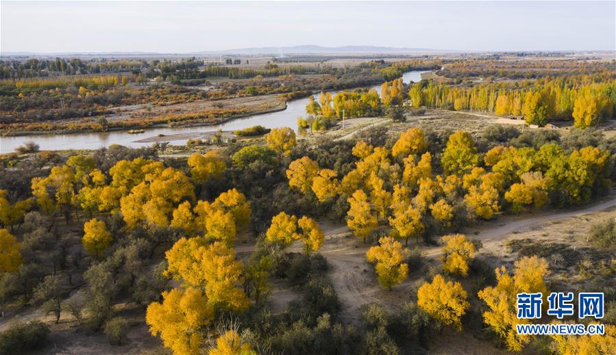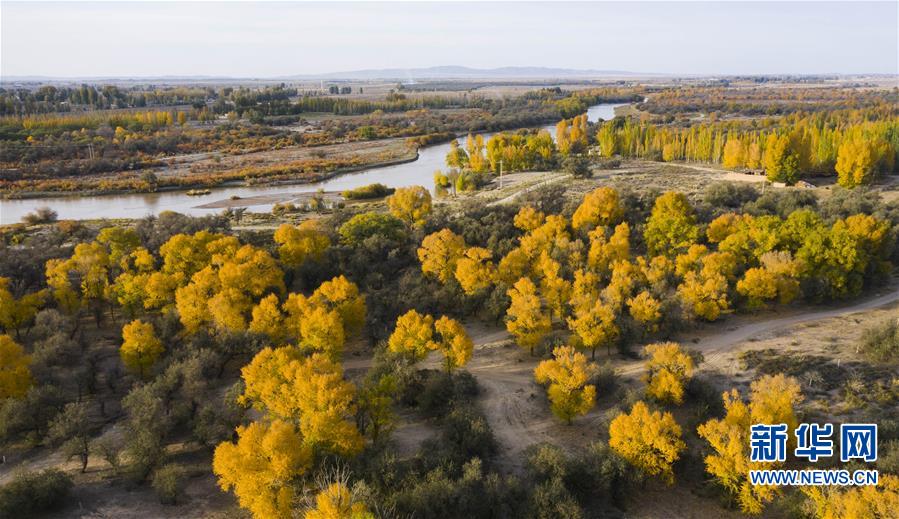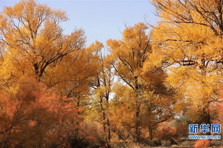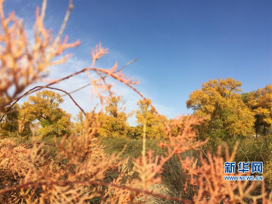 这是10月14日在甘肃省武威市民勤石羊河国家湿地公园拍摄的秋景。 又到一年金秋时,在拥有“中国沙乡”之称的甘肃省武威市民勤县,胡杨、红柳等沙生植物尽染秋色,美不胜收。 新华社记者 郭刚 摄
