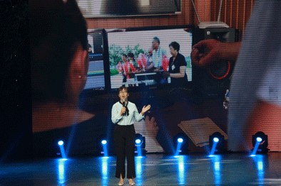 8月30日,辽宁省第六届“好记者讲好故事”演讲比赛决赛现场,关妮妮在动情演讲。背景的大屏幕正播放纪录片中金锦华一家祭扫志愿军烈士的画面。 照片由受访者提供