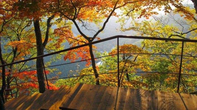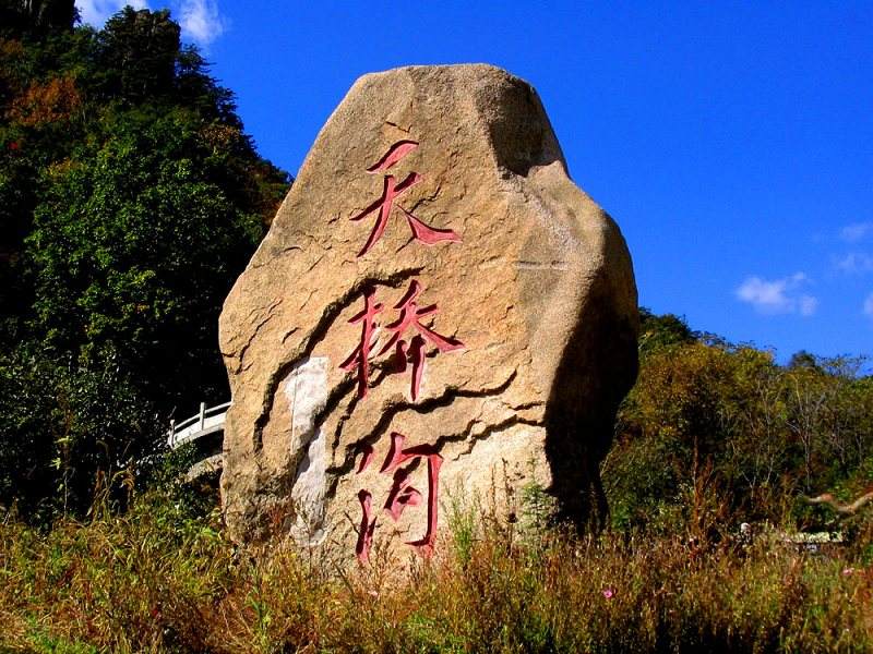 天桥沟森林公园 位于辽宁省宽甸满族自治县境内,属长白山脉老岭支脉,占地面积4000多公顷.现有天宫景区、莲花峰景区、玉泉顶景区、晓月峰景区、溪边栈道五大游览区域,共计125个景点。被中国旅行家杂志评为“中国枫叶最红最艳的地方”。
