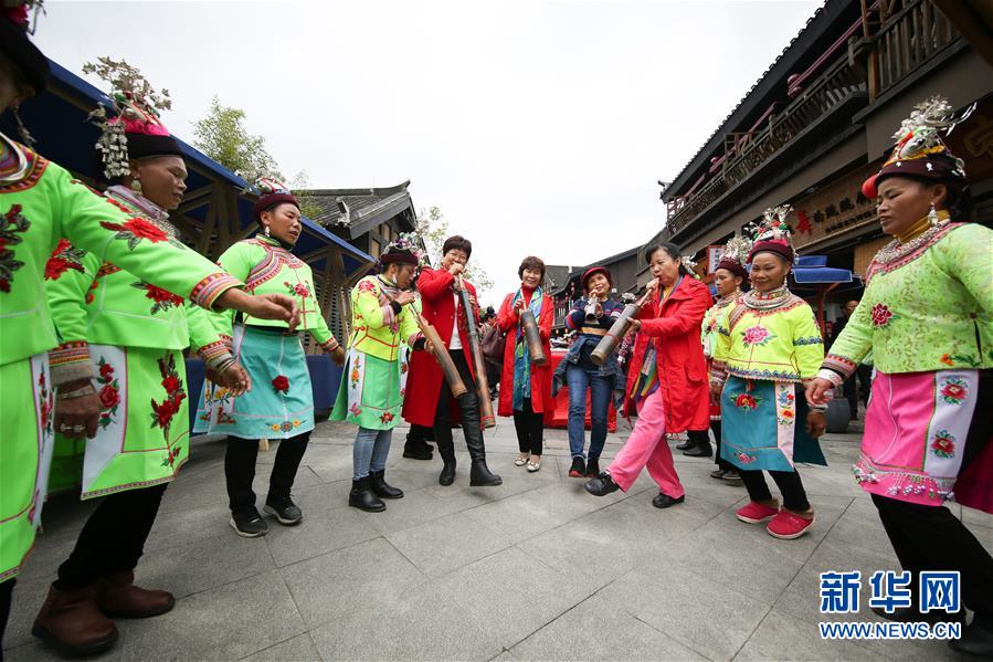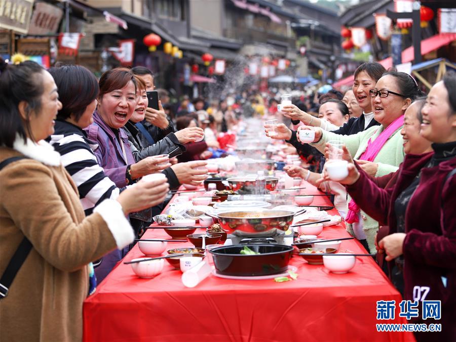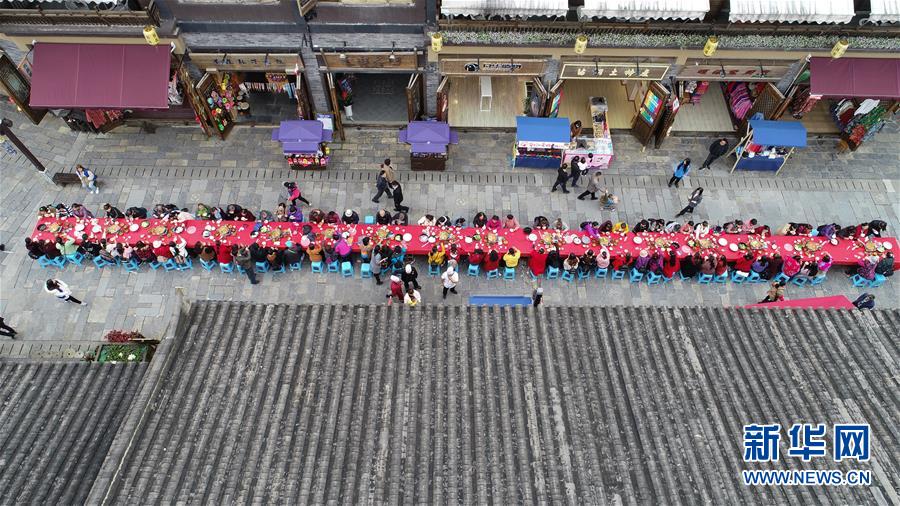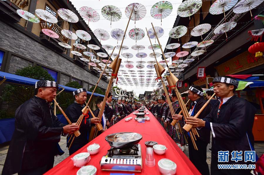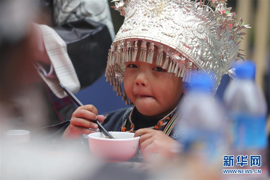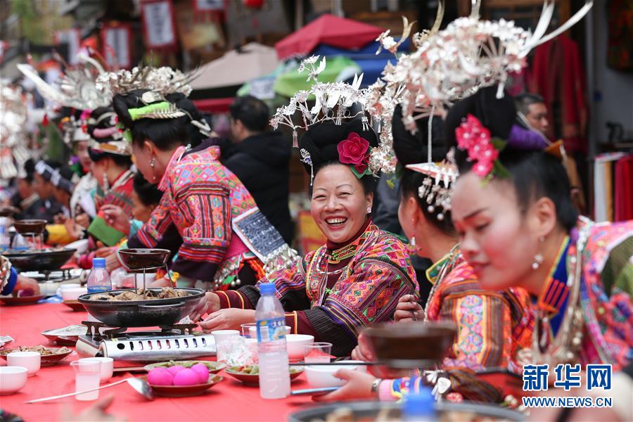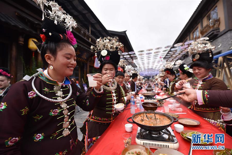 10月18日,苗族群众在贵州省丹寨县万达小镇吃新节长桌宴上品尝佳肴。 当日,贵州省黔东南苗族侗族自治州丹寨县万达小镇举办苗族吃新节体验活动。当地苗族同胞跳芦笙舞、品长桌宴,并邀请游客参与其中,大家在欢声笑语中乐享金秋。 新华社发(唐树军 摄)