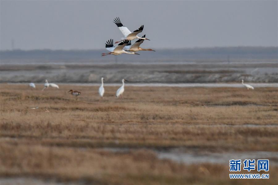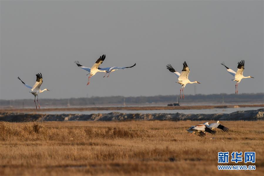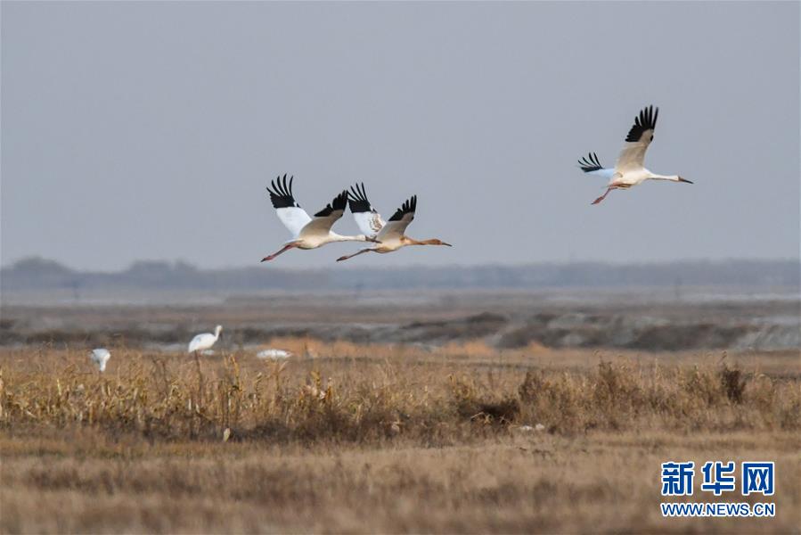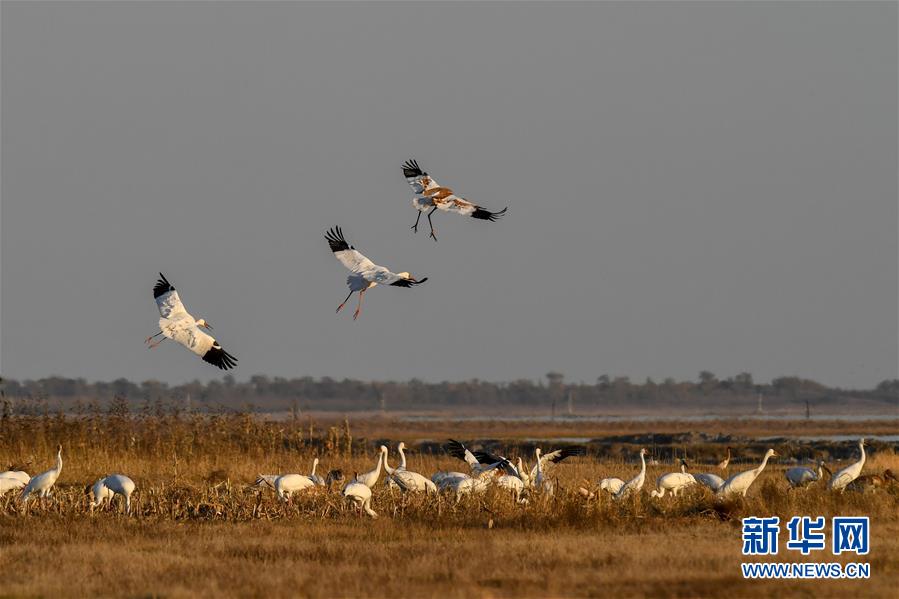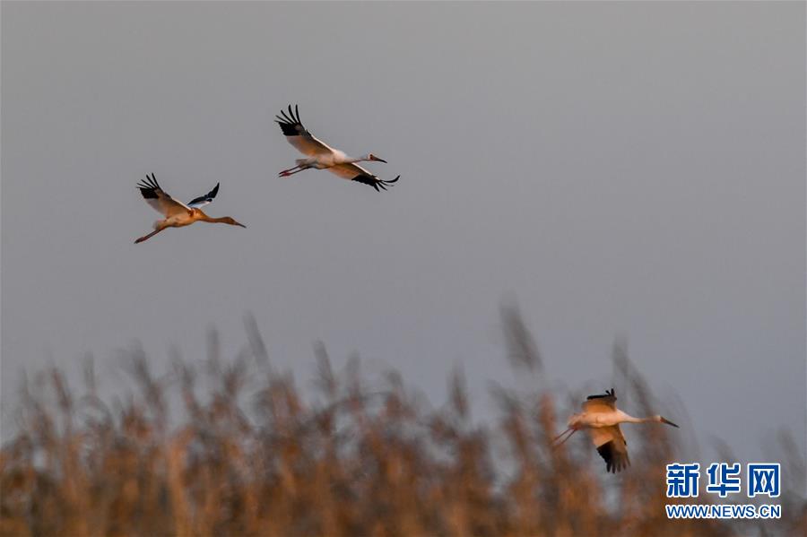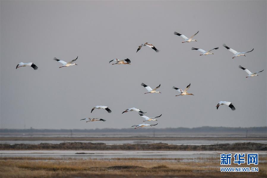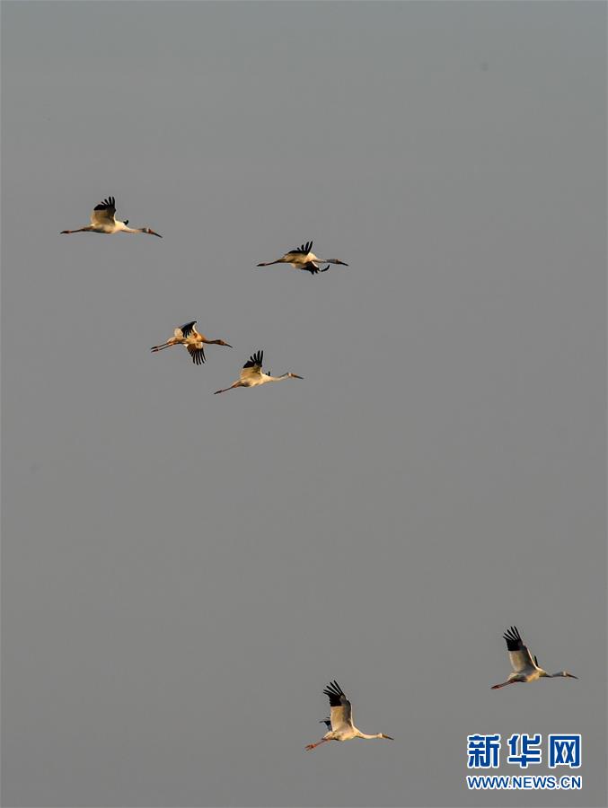 10月19日,在位于吉林省白城市镇赉县的莫莫格国家级自然保护区,成群白鹤从湿地上空飞过。 近日,在吉林省白城市镇赉县,近千只白鹤来到莫莫格国家级自然保护区停歇。白鹤部分种群繁殖于西伯利亚地区,在中国鄱阳湖越冬,莫莫格湿地是它们每年秋季南迁的重要停歇地。 新华社记者 张楠 摄