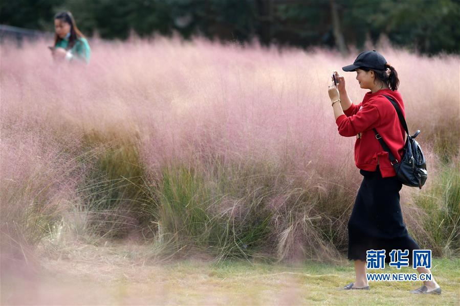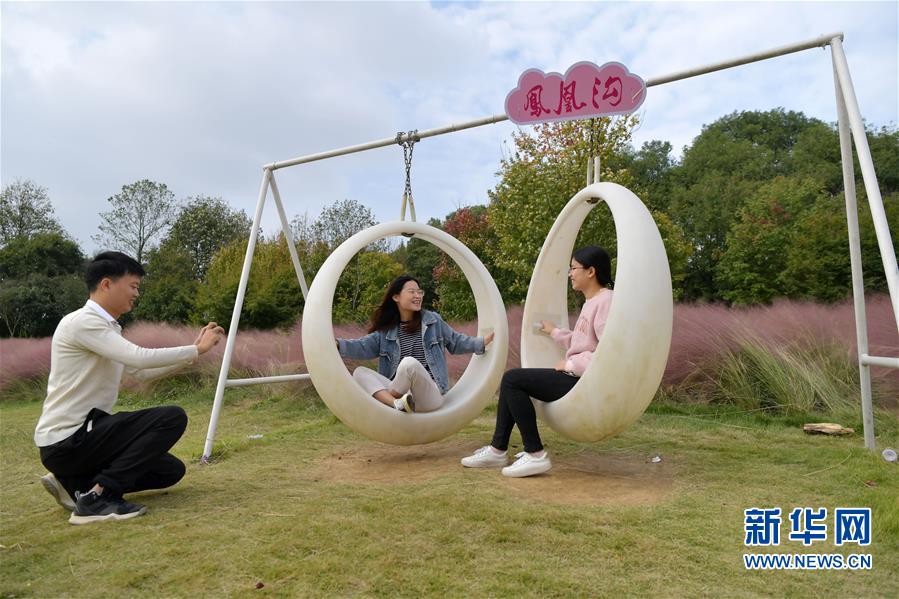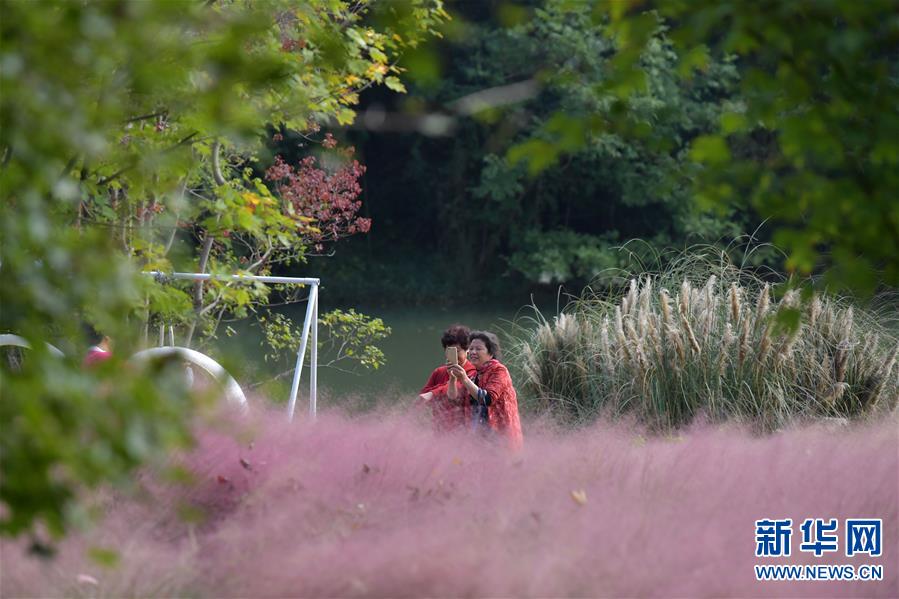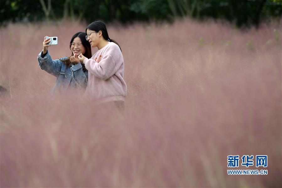 10月21日,在南昌市南昌县凤凰沟景区,游客在粉黛乱子草丛中拍照游玩。 金秋时节,南昌市南昌县凤凰沟景区内大片粉黛乱子草呈现出粉色“云雾”的梦幻景色。 新华社记者 彭昭之 摄