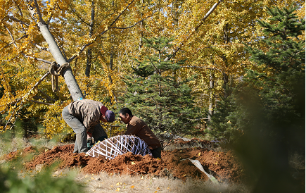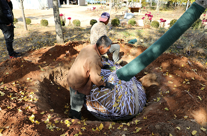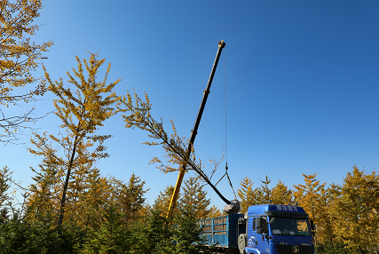 据现场的工人介绍,这座银杏林场种有近300亩的银杏树,大部分的树龄在10年以上。为了准备当天要发往新疆的银杏树,工人们6点就来到现场开始挖树,每一棵树,要花上3个小时才能“起坑”。因为银杏树的根系水分大且脆,所以挖苗时就一定要带上原生长地的土壤,加上北方气候干燥,所以从丹东运输出的银杏树带上的土球要格外大一些。为了防止水分流失,“起坑”后的银杏树,需要在根部用网状的布带条锁住附带的泥土。48棵银杏树装满3辆长斗运输车出发去往新疆,它们将在路上奔波5天到达目的地再次“安家落户”。