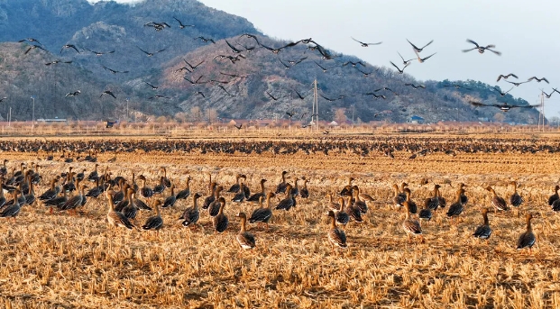 鸿雁、豆雁、灰雁和白额雁家族,组团来到大孤山脚下、201国道旁稻田地里,补充体力。群鸟翱翔、雁鸣绵长的唯美生态画卷,为这里增添了勃勃生机。