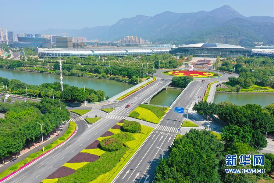 这是10月23日拍摄的福州海峡国际会展中心周边景色(无人机照片)。金秋十月,漫步福州城区、内河两岸,满眼是郁葱的绿树,紫色的三角梅、粉色的美丽异木棉等也竞相绽放。榕城处处呈现生机活力、绚丽多姿的秋日浪漫。 新华社记者 林善传 摄