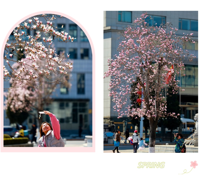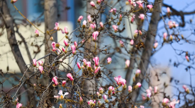 随着气温回暖,丹东的春天悄然揭开序幕。作为这座城市春天的首位“使者”,位于十纬路与滨江路交叉路口的数棵玉兰树即将迎来一年一度的盛花期。