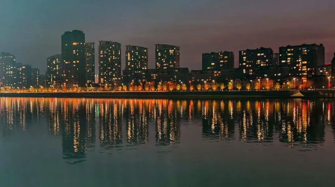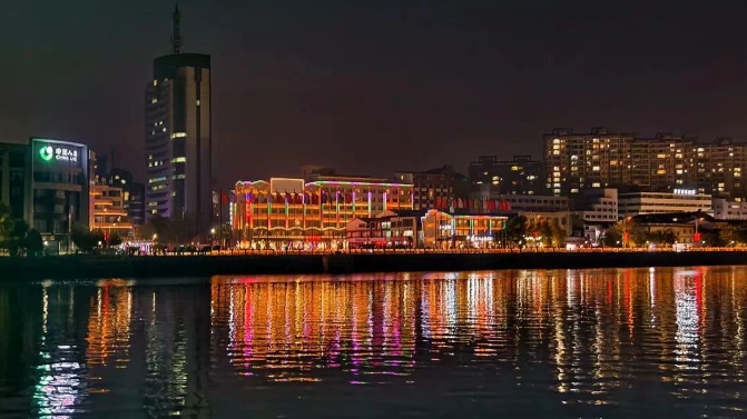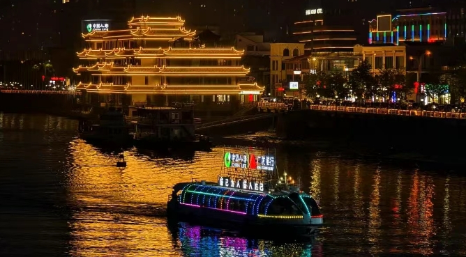 游船在轻柔晚风中徐徐穿行于江中,凭栏远望,丹东市区高楼光影如林,灯火璀璨,江面倒影摇曳生姿。