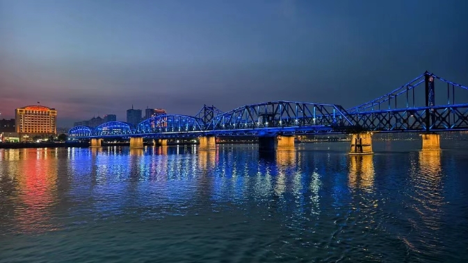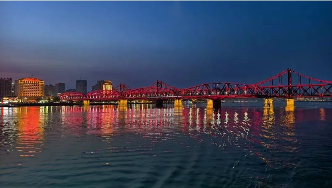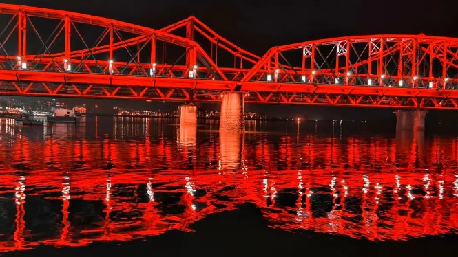 鸭绿江断桥这座历经烽烟的地标,在精心设计的灯光映衬下,历史沧桑与现代光芒交织碰撞。