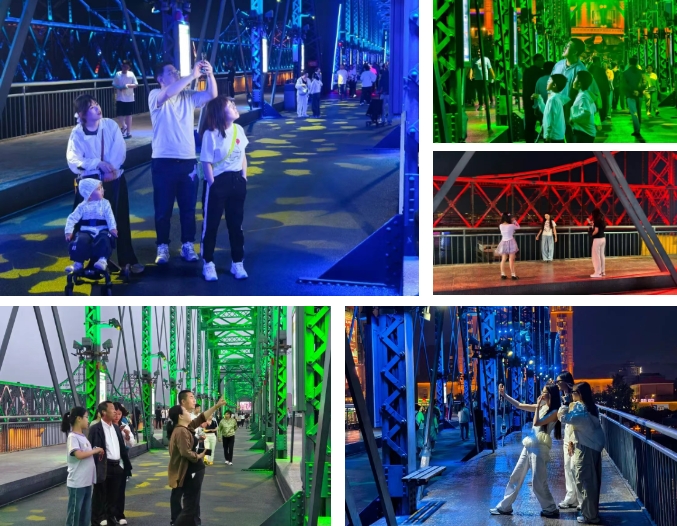 游客们纷纷登上霓虹璀璨的鸭绿江断桥,感受历史纵深与现代光影交融,欣赏美如画卷的鸭绿江夜色。
