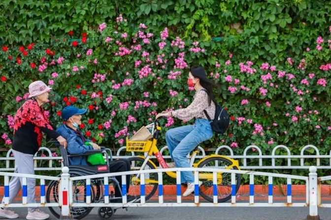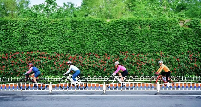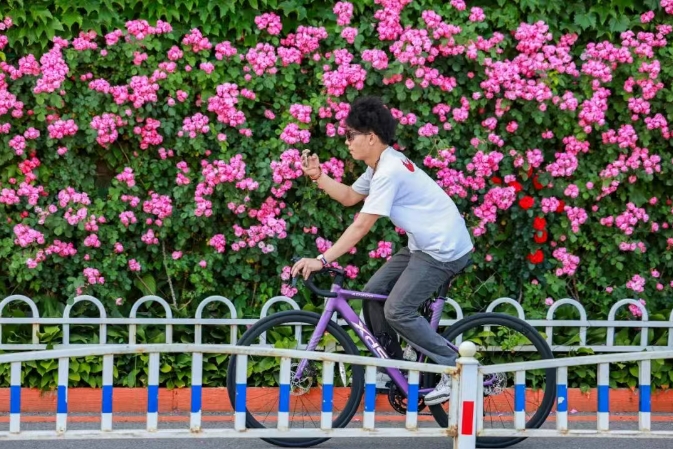清晨时分,跑步爱好者踏着朝阳穿行花影之间;骑行者迎着江风,车轮卷起落英,与盛开的繁花一同勾勒出一幅动感十足、充满活力的城市剪影。