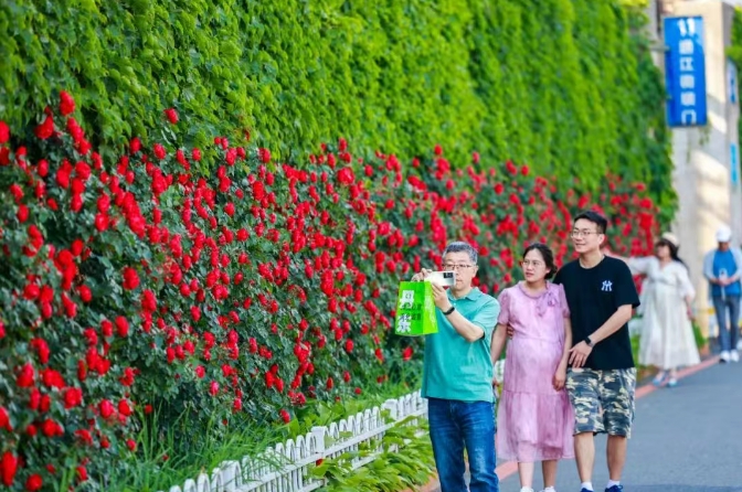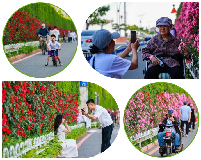 近日,滨江中路迎来一场浪漫“花事”——进入盛花期的蔷薇花与月季花竞相绽放,将千米绿墙装点成一幅梦幻童话画卷。这抹突如其来的浪漫气息,吸引了众多市民携亲伴友前来,在花墙下定格初夏的笑颜。