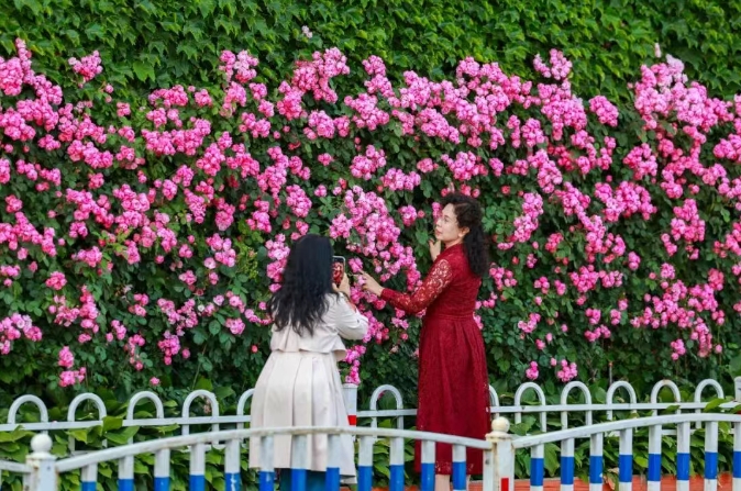 红的热烈、白的纯净、粉的娇媚——单瓣与复瓣层层叠叠,花朵簇拥绽放;微风拂过,花枝轻摇,阵阵清香扑面而来,令人心旷神怡。粉红色的花朵自高处倾泻而下,仿佛一幅天然铺就的巨型花毯,惊艳每一位到访者。