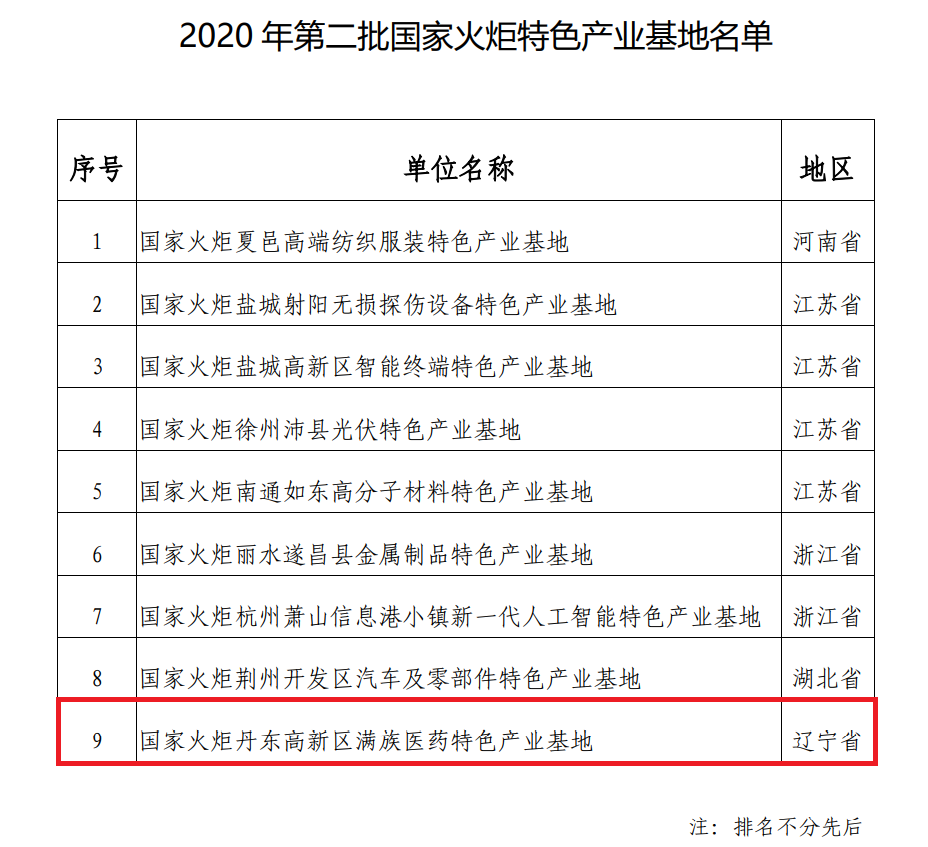 近日,科技部火炬中心公布2020年第二批国家火炬特色产业基地名单,国家火炬丹东高新区满族医药特色产业基地成功获批。这是丹东高新区满族医药特色产业基地获得的又一国家级“金字招牌”,也是辽宁省2020年度唯一获批的火炬基地。