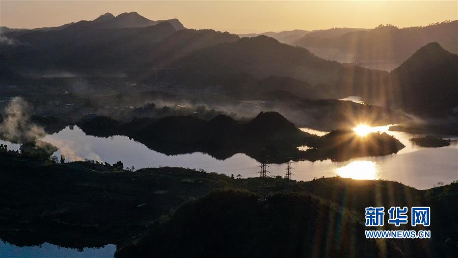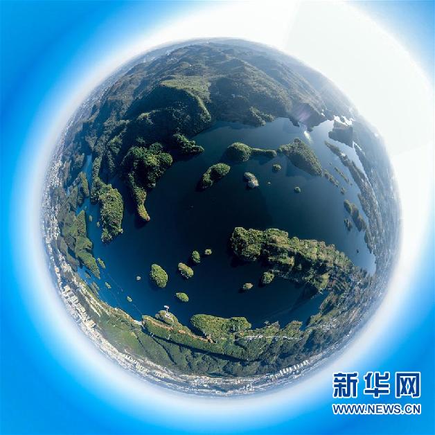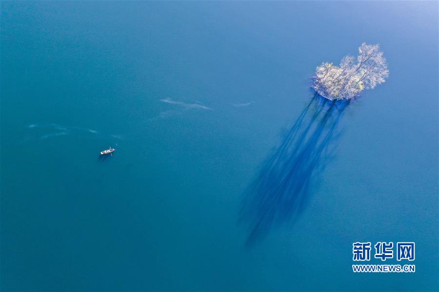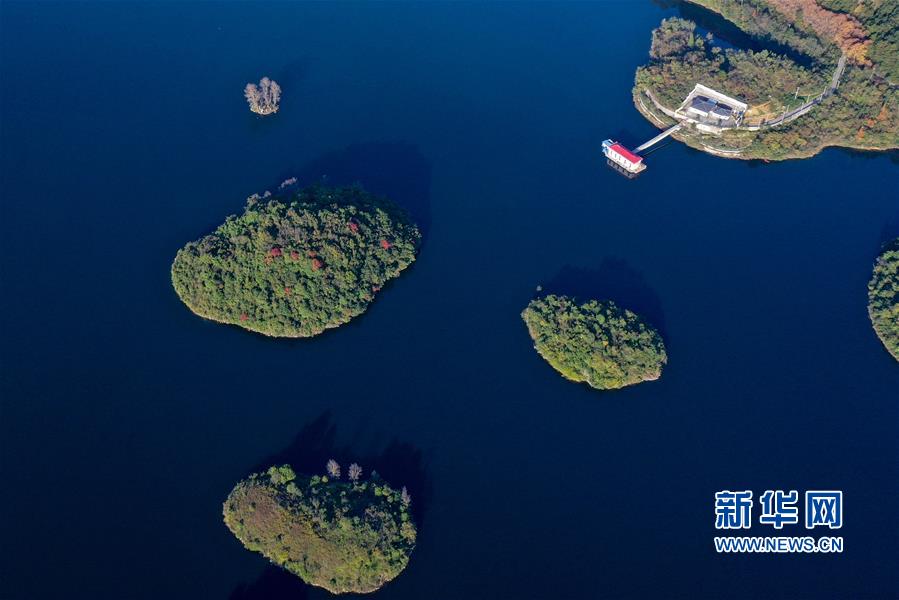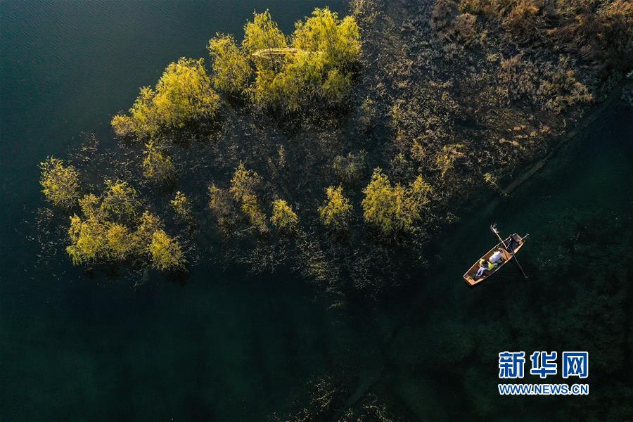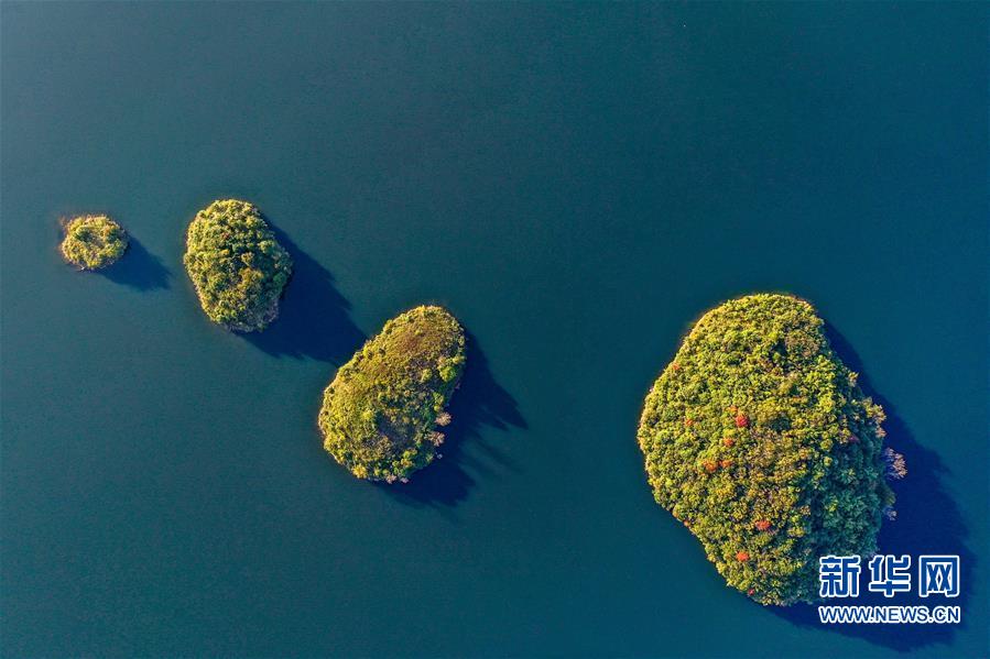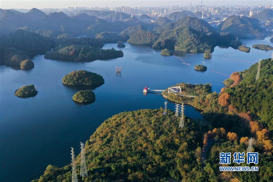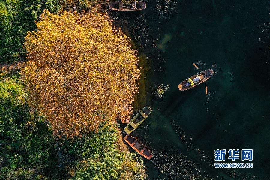 11月10日,小船在阿哈湖国家湿地公园内游弋(无人机照片)。 初冬时节,贵州省贵阳市阿哈湖国家湿地公园色彩斑斓,景色怡人。 新华社记者 欧东衢 摄