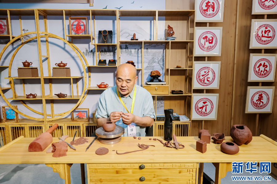 图为在辽宁省文体旅融合发展交流展示活动中的朝阳馆,工作人员展示紫陶制作技艺。新华网发