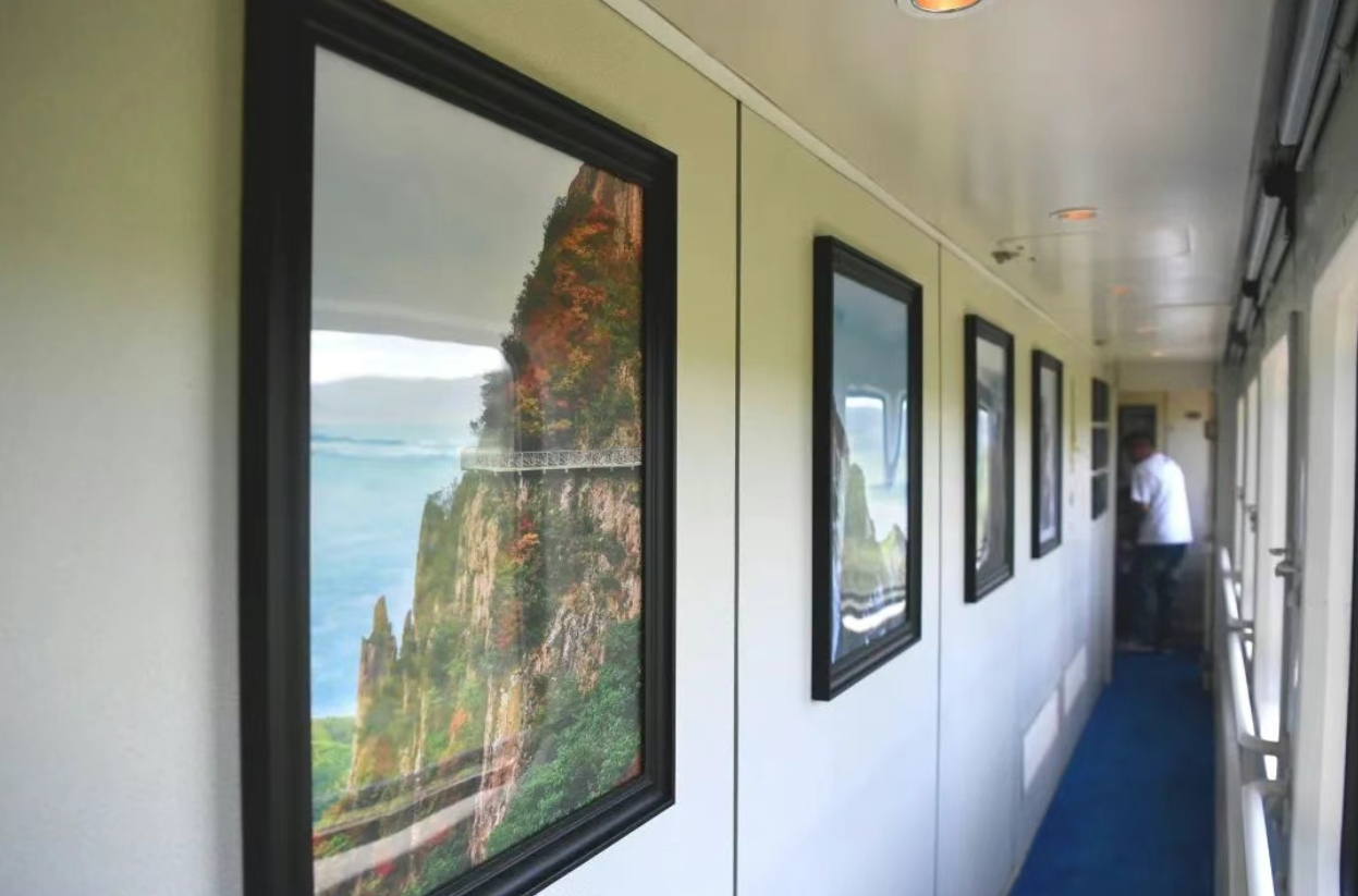 列车车身以丹东凤凰山、虎山长城垛口、鸭绿江断桥、上河口国门等标志性景区为设计元素,构成一幅幅流动的山水画,成为连接沈阳和丹东的“行走的城市文化名片”。车内,抗美援朝老照片复刻展板和丹东各大景区宣传画悬挂在车厢之间,向旅客展示着英雄城市的独特魅力。车上特别安排的历史行进式表演,更让游客身临其境地感受丹东的历史和文化。
