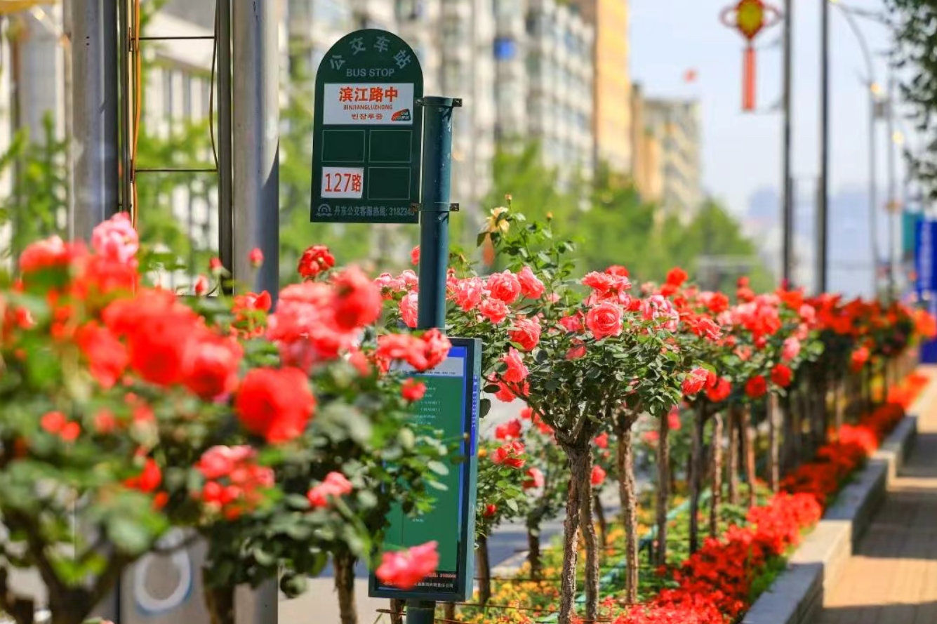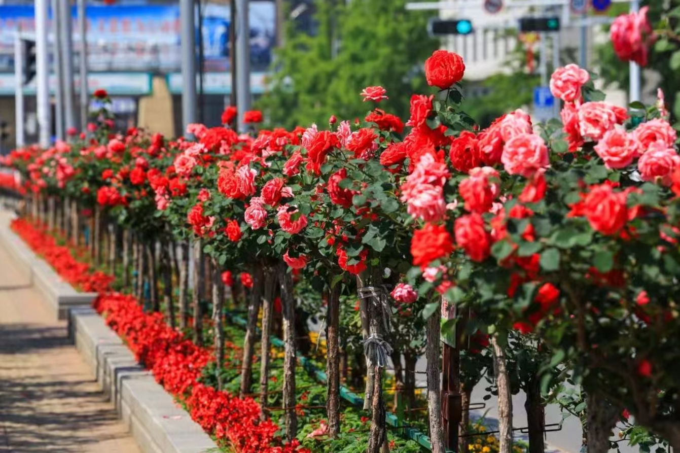 漫步在滨江路,一株株树状月季迎风绽放,仿佛好客的丹东人张开双臂,热情迎接四方来客。粉色、红色、黄色的花朵层层叠叠,宛若天边绚丽的云霞。