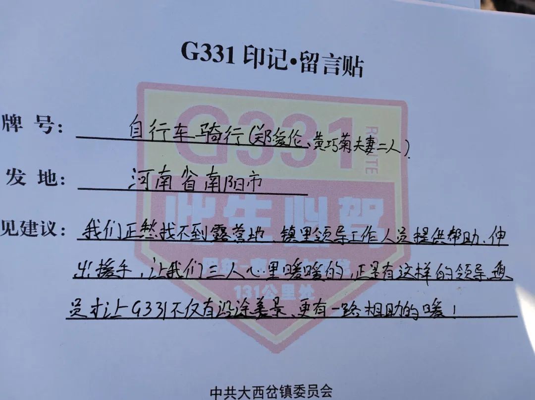 此时的政府大院如同一个微缩的“旅途沙龙”。相识或不相识的自驾游爱好者们在此畅谈旅途见闻,分享路况信息,憧憬前方美景。爱好摄影的游客举起手机、相机,打卡拍照,记录下别样的灯火人间。第二日,当晨光熹微,大西岔政府的院子里又恢复了生机,准备启程的游客们整理行囊,再次出发。“真心为大西岔镇政府点赞。”“欢迎你们到我的家乡旅游,换我招待你们。”机关党员服务驿站的志愿者设置了“旅人印记留言板”,游客们真诚质朴的留言,让志愿者倍感温暖。