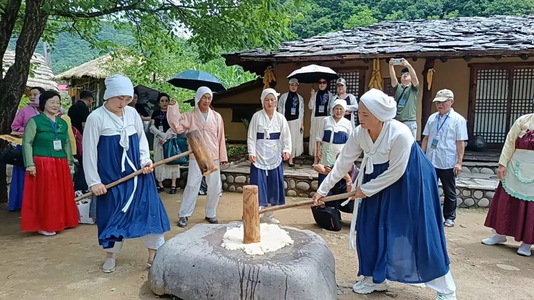在民俗文化展示体验区,百年老屋前,男子肩背稻草、女子头顶木盆,真实再现了百年前朝鲜族庭院生活场景;舂米、磨面、捶布等传统劳作展示吸引游客驻足体验,沉浸式的文化互动让人仿佛穿越时光,对朝鲜族传统生活有了更为直观的感受。