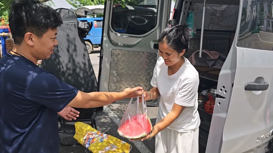 “天气闷热,他们就给我送西瓜和水,还提醒我注意防暑降温。看我带着小猫,就送来了香肠、虾干。发现我洗的衣服晾在车后的棚子里,还主动帮我找了更合适的位置。”一名来自广东的自驾博主说道。
