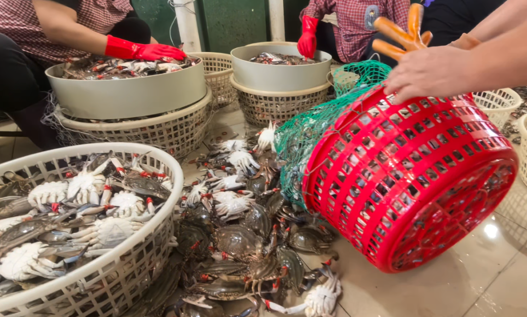 岸边停满货车,渔民与工人通力合作,将梭子蟹通过传送带运上车。随后,大部分运往东港黄海水产品批发市场,分拣后进入各大市场。几日冷清的市场也因开海骤然热闹起来。