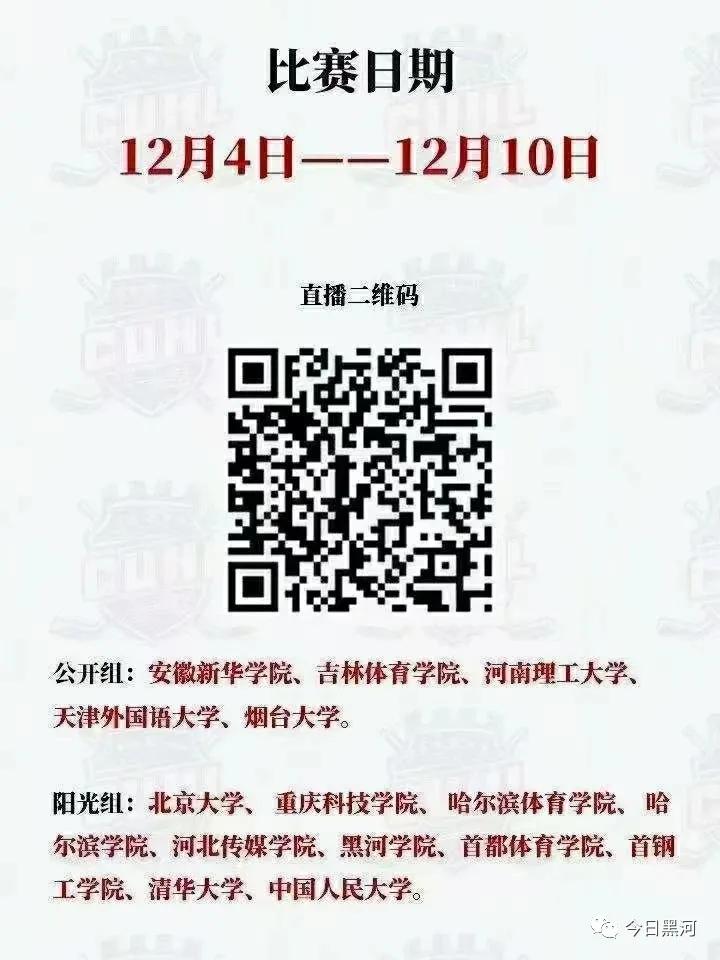 12月7日,黑河学院“北疆龙”冰球队以比分4:0胜哈尔滨体育学院冰球队(第一届阳光组冠军),获得本场比赛胜利。