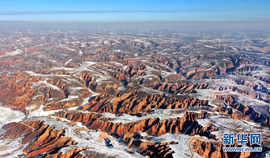 12月3日拍摄的雪后初霁的陕西省榆林市麻黄梁黄土地质公园(无人机照片)。