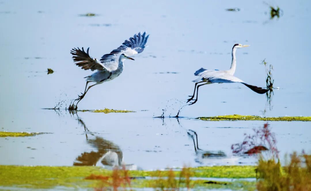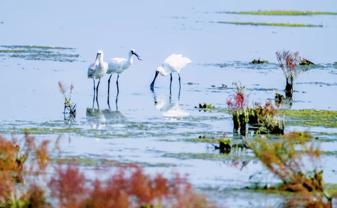成群的黑脸琵鹭、黑腹滨鹬、环颈鸻、黑翅长脚鹬、蛎鹬、苍鹭等珍稀水鸟或在滩涂上觅食,或在空中嬉戏,为这幅天然彩色画卷注入了无限生机。