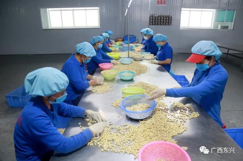 △东兴市一家边境落地加工企业内,工人们在分拣腰果。何璐璐/摄