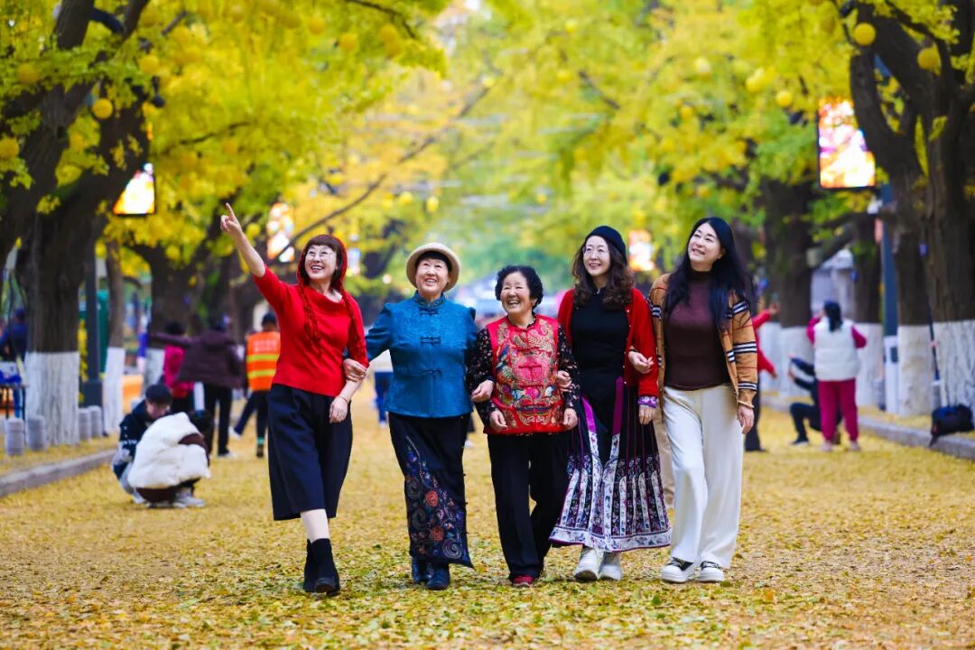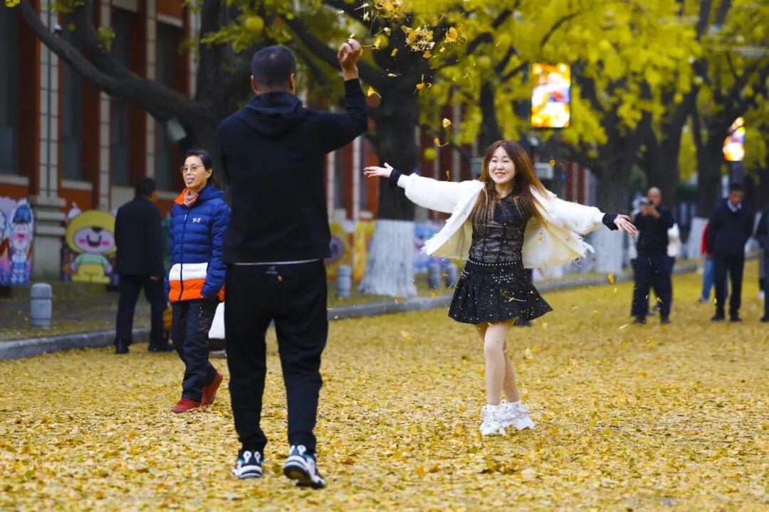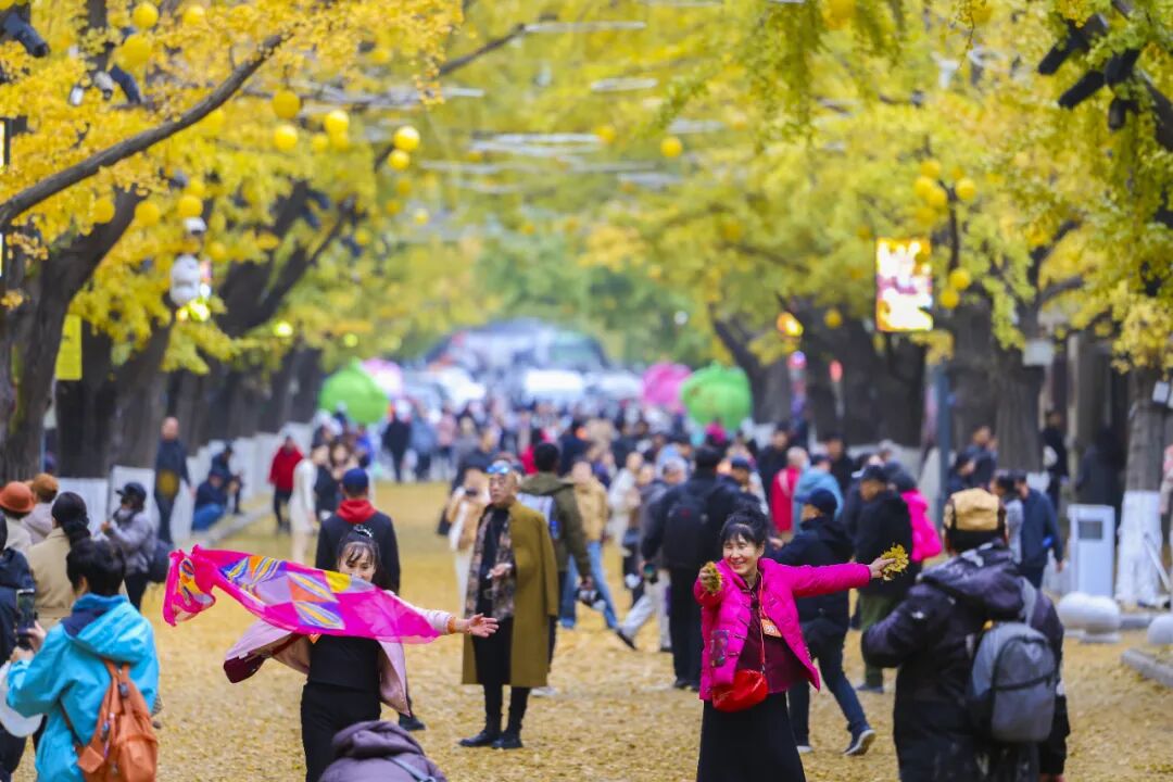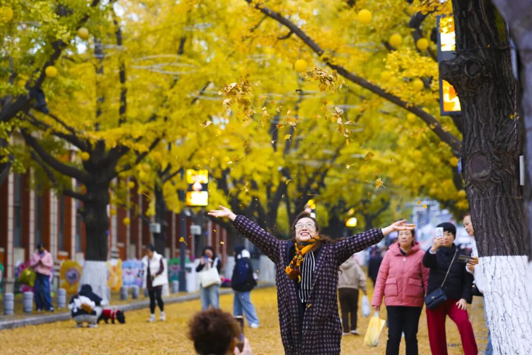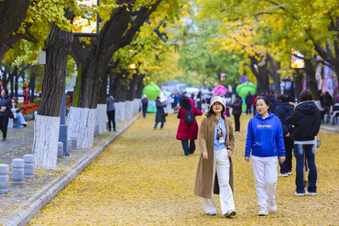 市民和游客穿梭其间,或驻足拍照定格美景,或仰头欣赏枝叶交织的金色穹顶。孩子们在落叶中嬉戏打闹,构成一幅人与自然和谐共生的温馨画卷。