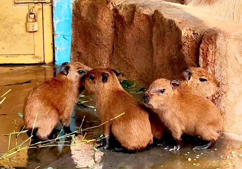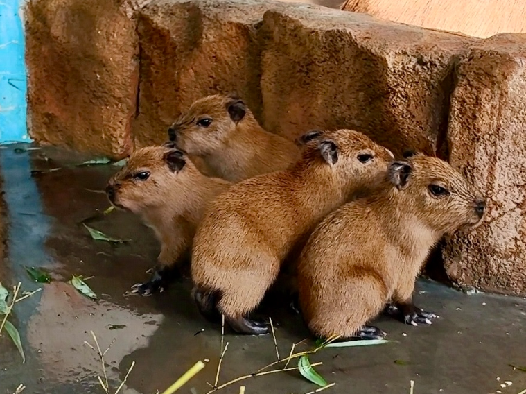 据饲养员介绍,这四只水豚的妈妈与水豚“双棒”的妈妈是同一只,时隔半年,它又再为水豚家族添新丁,小动物村的水豚家族已经13只豚豚啦。四只水豚宝宝延续了家族“萌系基因”,毛色呈深棕色,圆滚滚的身形像一颗颗猕猴桃,时而挤在妈妈身边撒娇,时而呼呼浅睡,一举一动都让游客忍不住拿出手机记录。