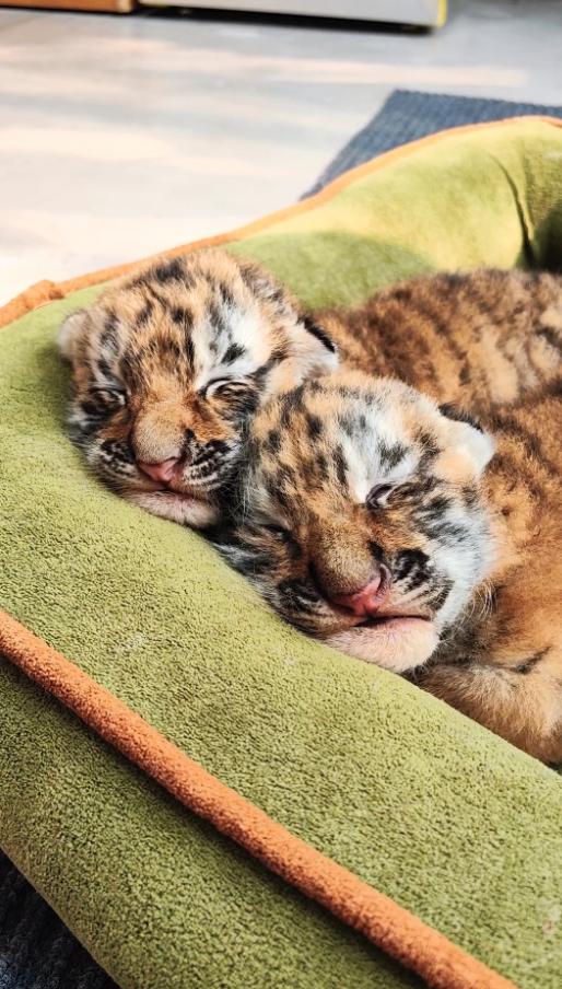 不仅水豚家族有好消息,小动物村还迎来了四只健康的小东北虎,由于雌虎母性不强,它们先后被送到小动物村进行“人工育幼”:其中三只虎宝出生不久,整日只知呼呼大睡,褪去出生绒毛的它们,已经换上了带有清晰黑色条纹的鲜亮皮毛;另一只小虎已满2个月,饲养员正开始逐步添加新鲜小肉粒,帮助它从喝奶粉过渡适应肉食习性,活泼好动的它,每当饲养员打扫时,总会围着扫帚、拖把调皮捣蛋,一会儿用爪子轻扒工具,一会儿绕着饲养员跑圈,灵动模样常让人“手忙脚乱”。