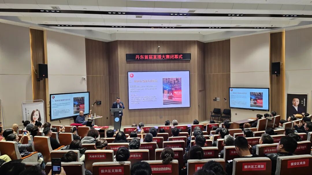 闭幕式现场流程紧凑、亮点纷呈。直播大赛总导师汇报大赛成果,学员优秀短视频作品进行集中展播,生动展现丹东的城市魅力与产业活力。