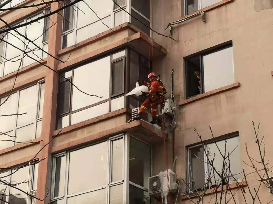 由于社区和物业公司均无法对此进行处理,有居民拨打了119求助。丹东市消防救援支队临江后街特勤站5名消防指战员接警后立即赶到现场,仔细观察分析楼体外侧结冰情况后,然后在居民楼周边设置了警戒带。在征得顶楼居民同意后,消防员决定采用自上而下、分层破拆的方式进行清理。为了不让敲下来的冰块殃及楼下住户的窗户玻璃和空调外挂机,用绳索悬吊在空中的消防员冒着危险,抱着巨大的冰块用力向远离楼体的无人区域扔去。经过近1个小时的努力,该居民楼从7楼到2楼的“冰溜子”被彻底清除。