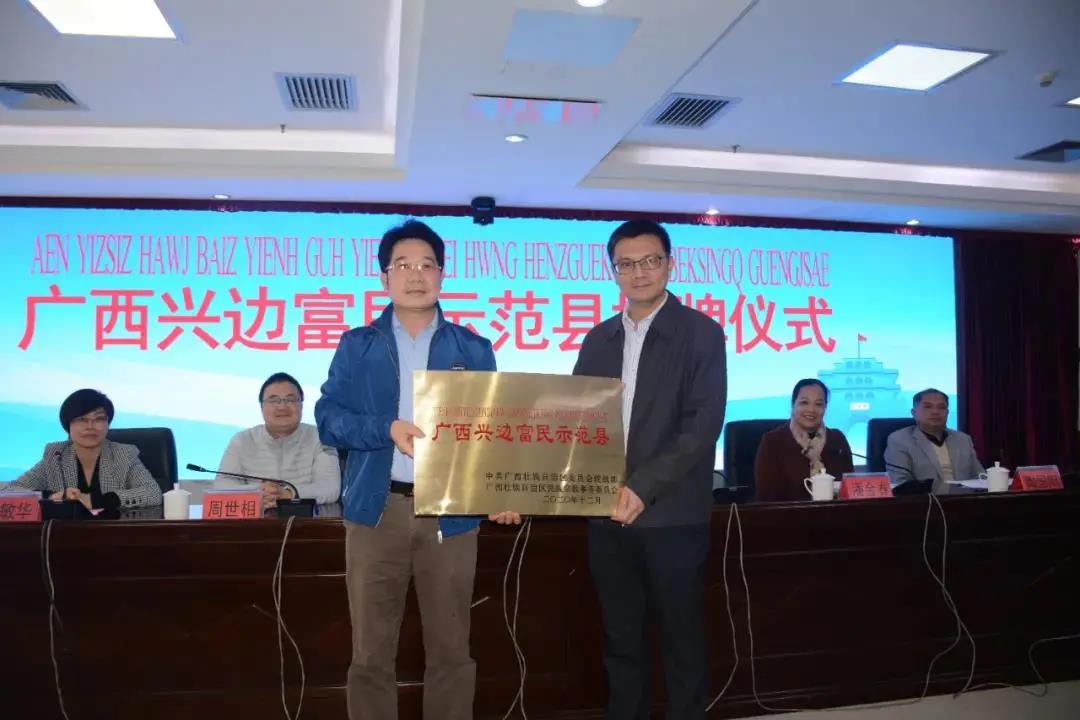 12月30日,广西兴边富民示范县授牌仪式在凭祥市举行。与会领导指出,此次授牌活动是对凭祥市扎实推进兴边富民行动示范创建工作成绩的肯定,希望凭祥市以此次命名为契机,继续将凭祥市打造成各民族共同团结奋斗、共同繁荣发展的示范窗口,为加快建设祖国南疆繁荣稳定和谐安宁示范区,建设壮美广西共圆复兴梦作出新的更大的贡献。