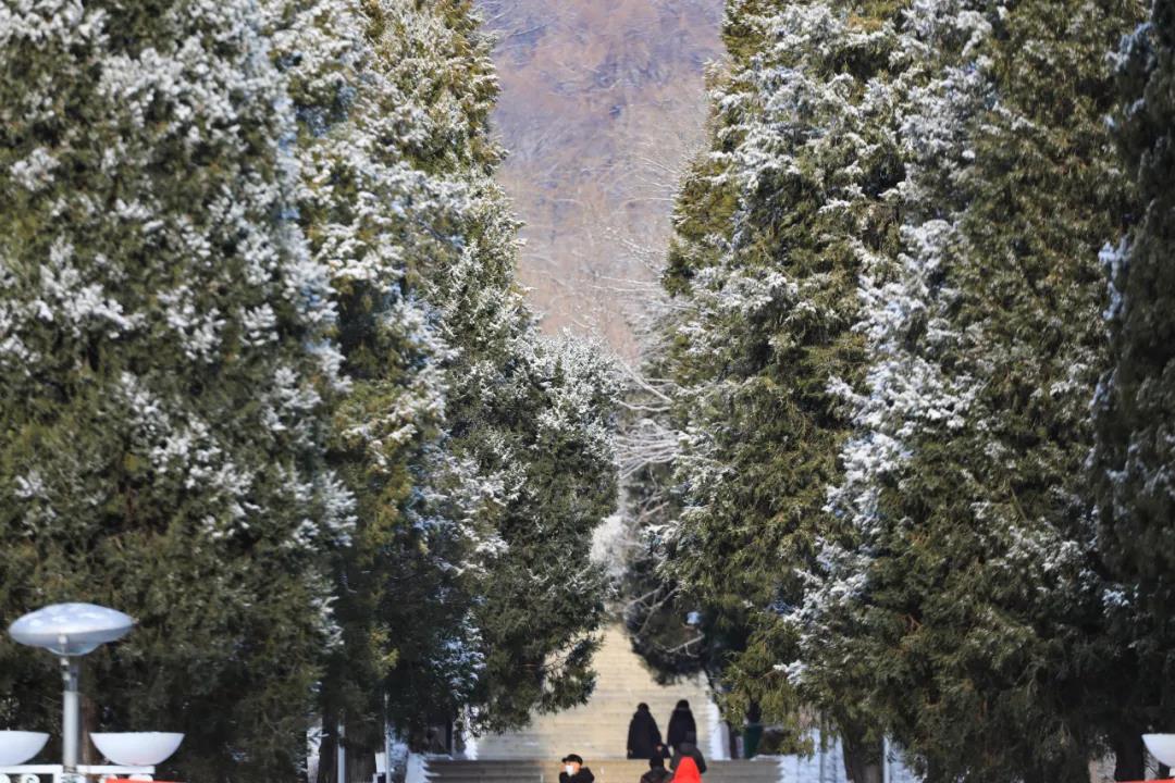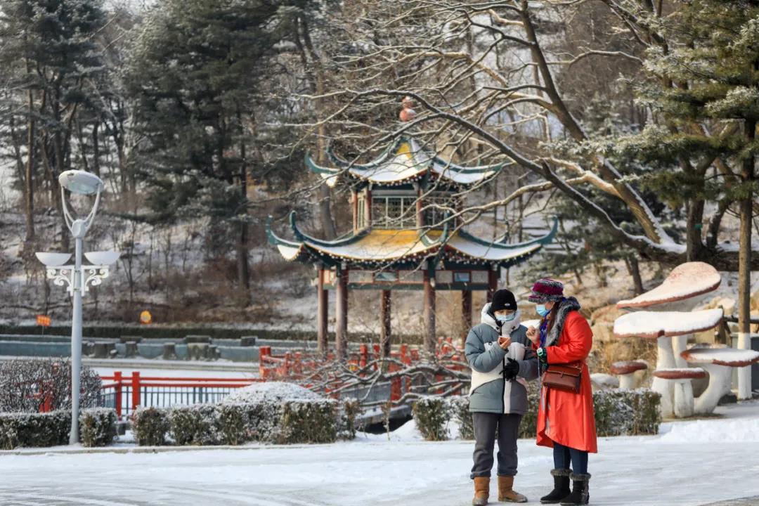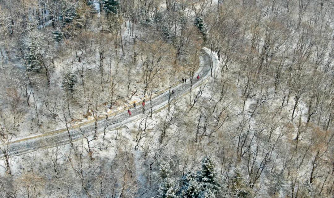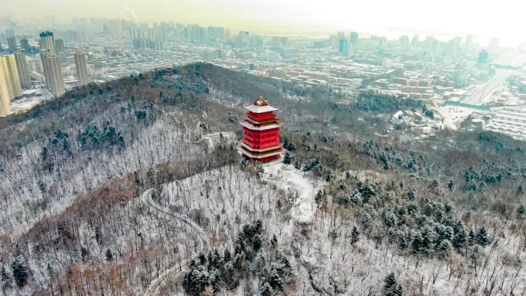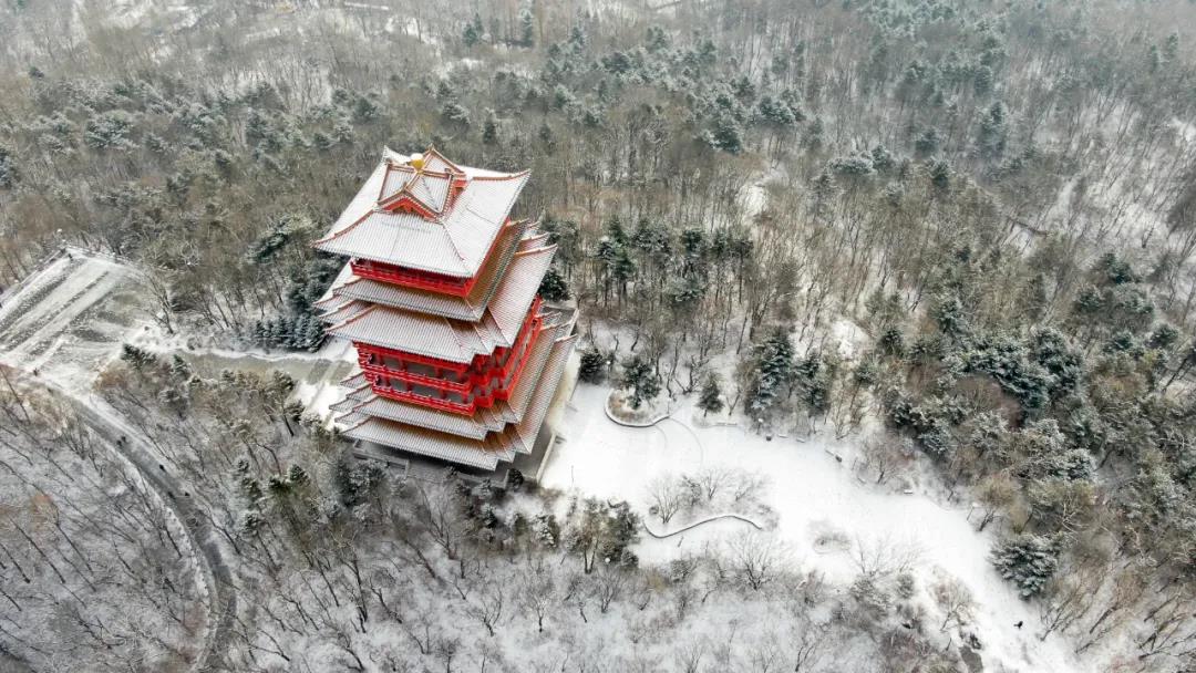 锦江山上,树上的雪花在微风吹拂下,飘飘扬扬地落下来,美不胜收。