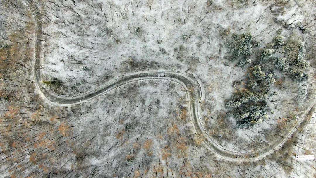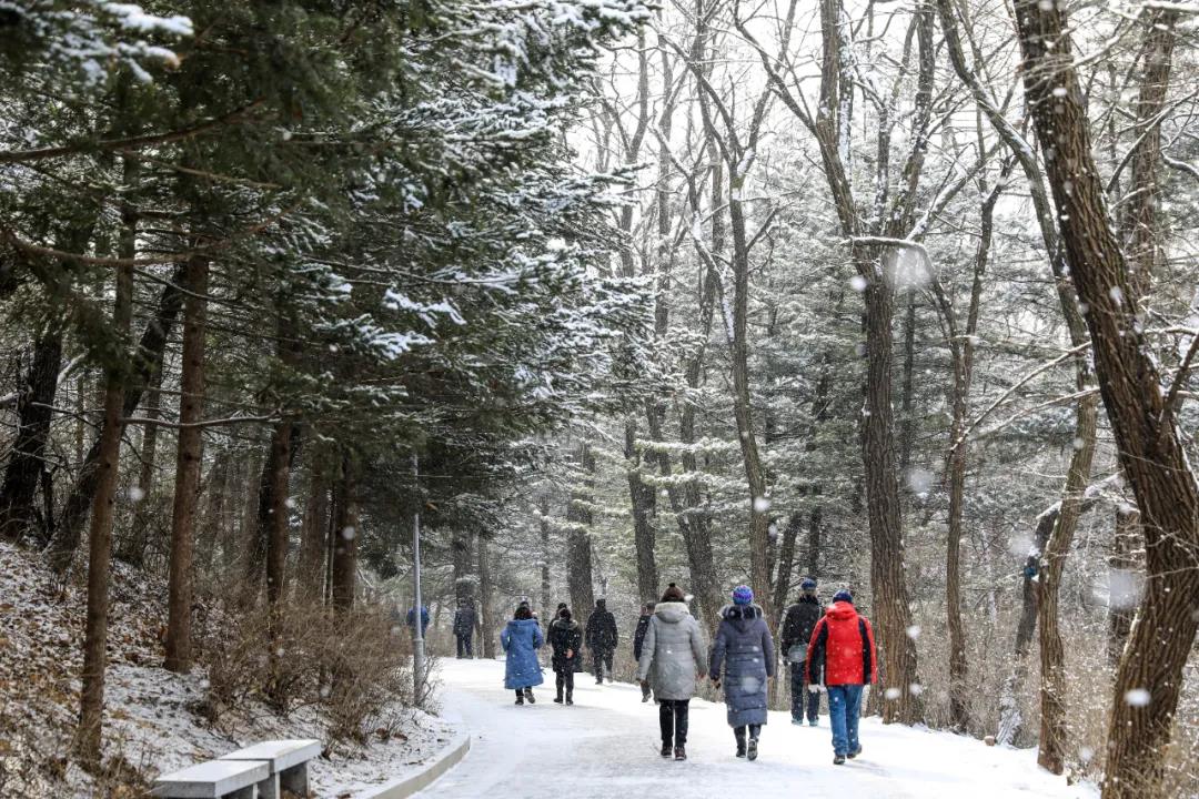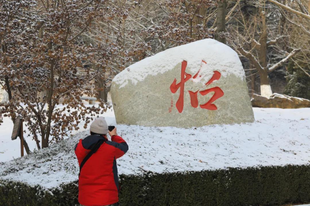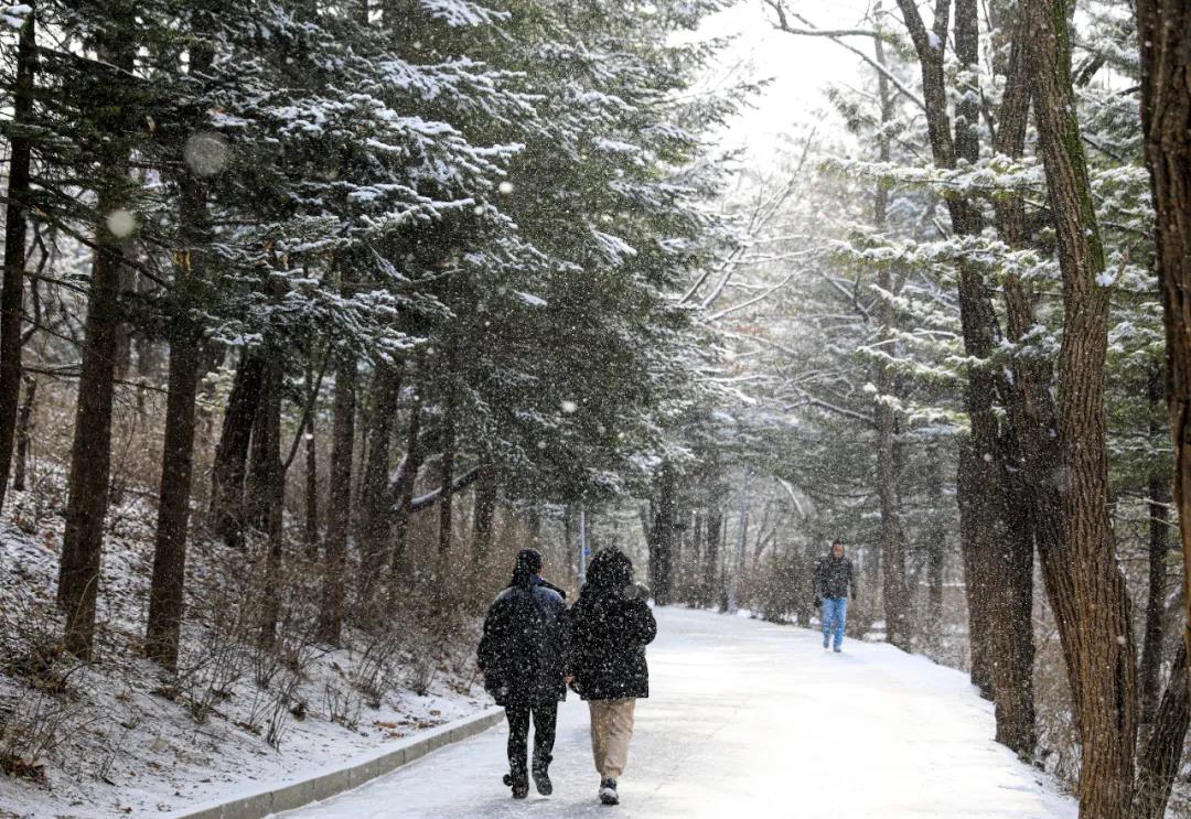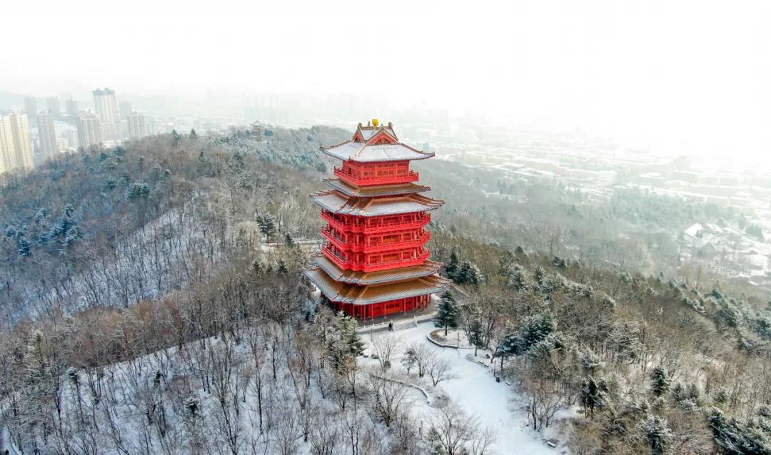 锦江山上,树上的雪花在微风吹拂下,飘飘扬扬地落下来,美不胜收。