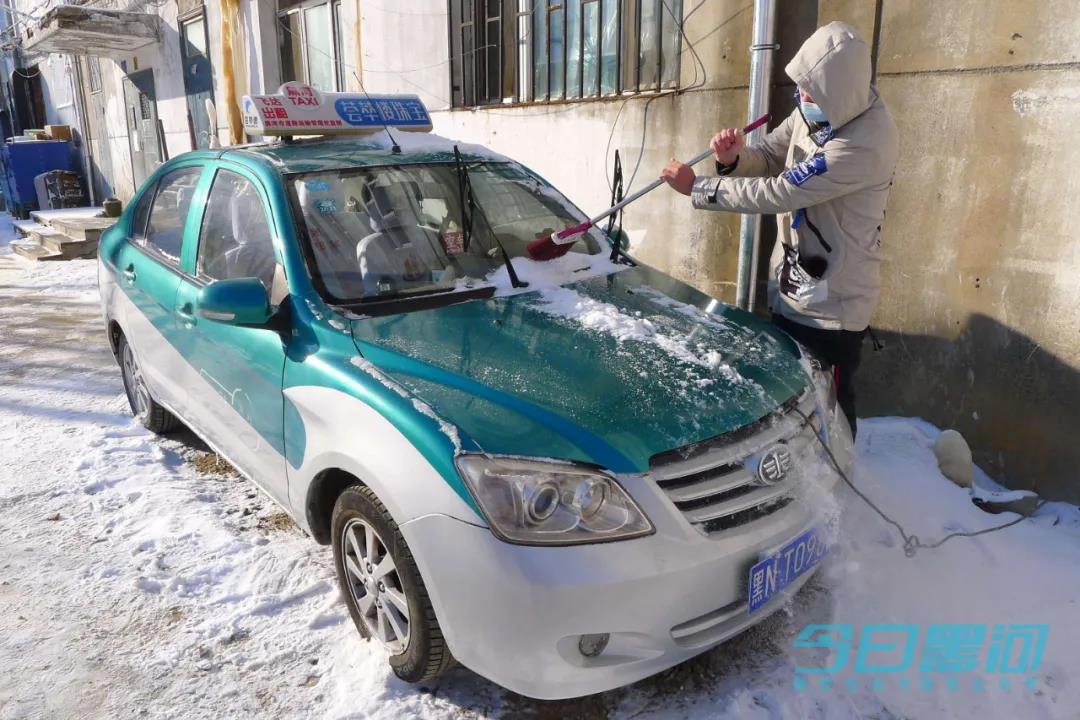 1月21日,黑河市一出租车司机在清扫车辆积雪准备复工。