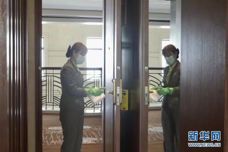 1月22日,在黑龙江省黑河银建建国酒店,保洁人员对房间进行消毒。新华社发