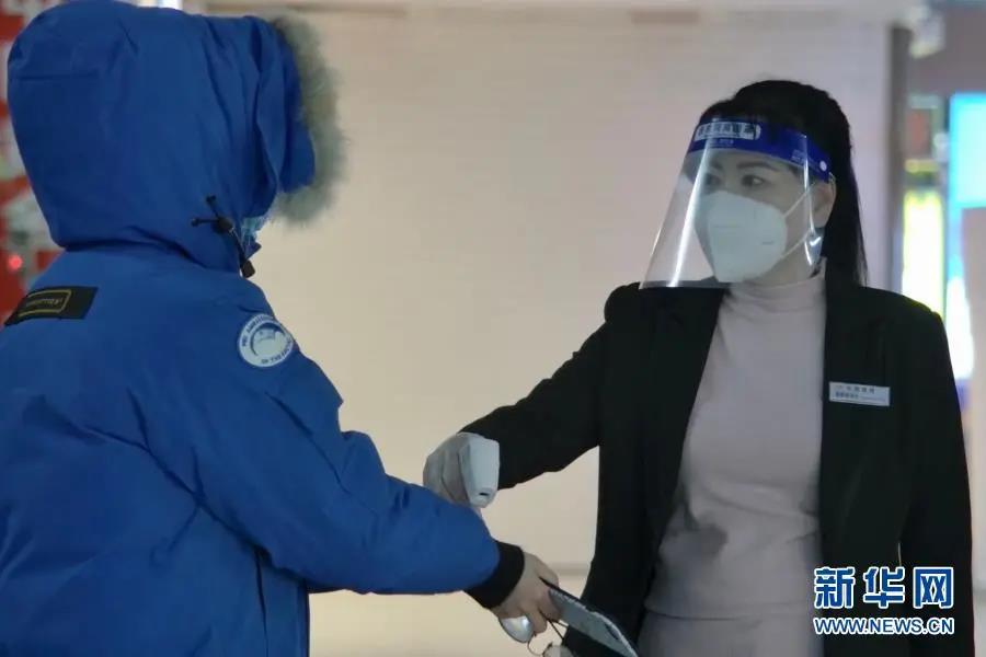 1月22日,在黑龙江省黑河华富商城,工作人员为顾客测温。新华社发
