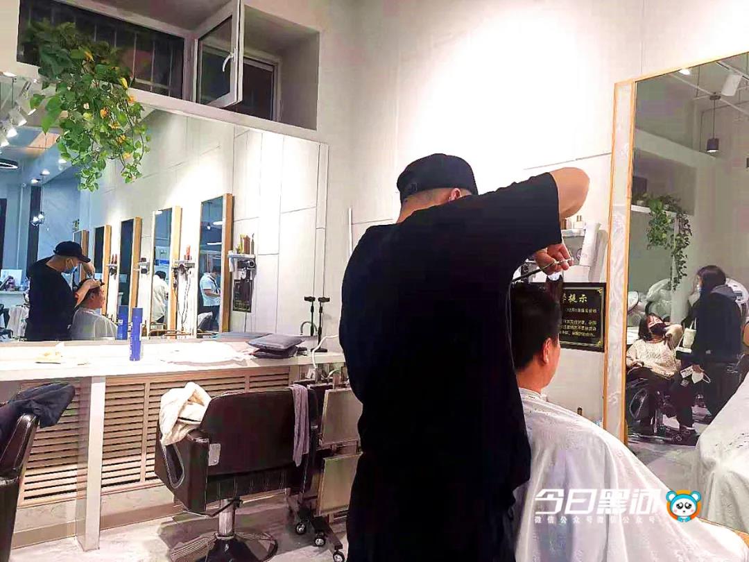 1月22日18时许,黑河市区一发廊内理发师正为顾客理发。他告诉小编,今天的顾客多为男性,他已经持续站立工作超9个小时。
