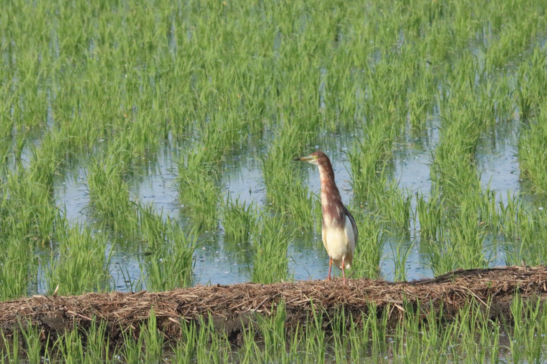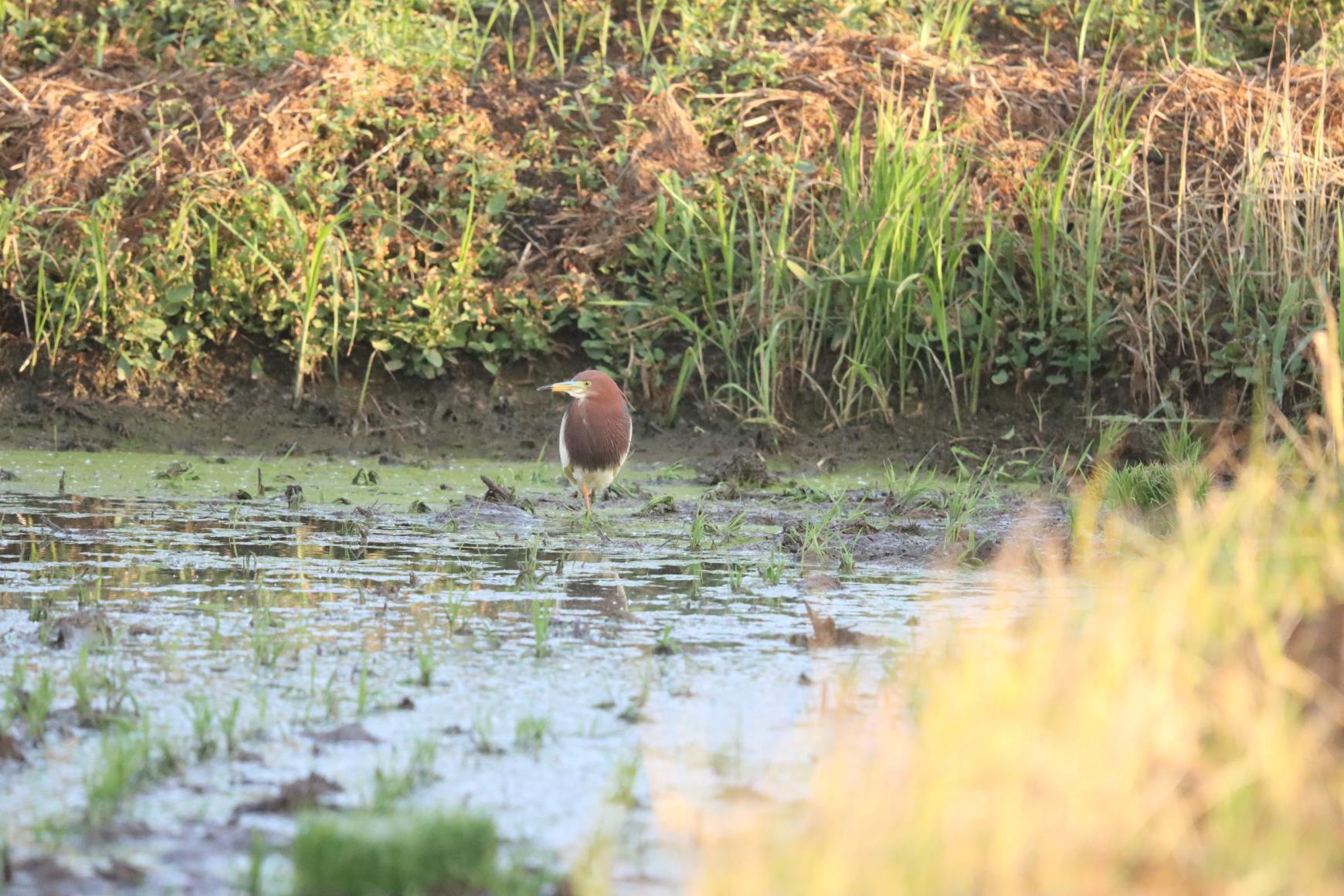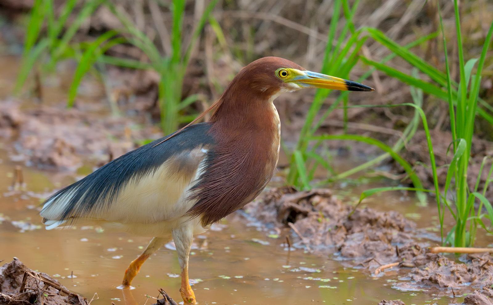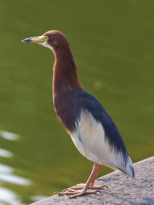 池鹭体长约47厘米,翼白色、身体具褐色纵纹,头及颈深栗色。通常无声,争吵时发出低沉的呱呱叫声。