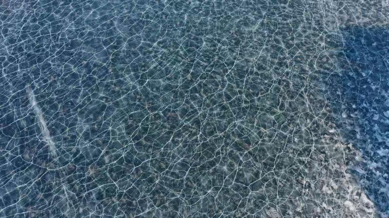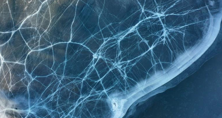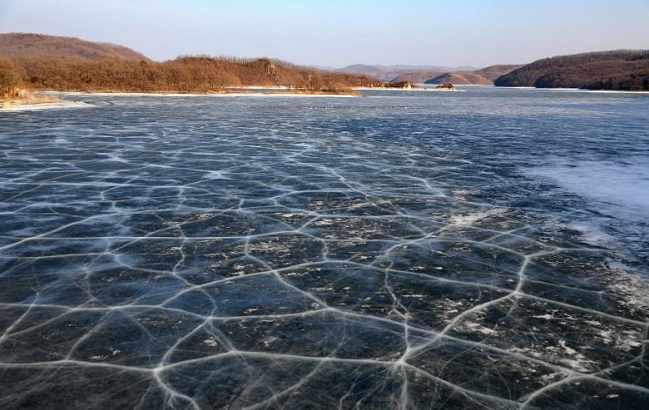由于今年冬季气温变化幅度较大,土门子水库冰面上可以看到明显的冰裂,从坝体一直延伸到整个水库,随着视角的变换,冰面色泽、条纹、条带,色块的亮度、走向、结构亦随之发生变化。顺光时,冰面颜色最深,呈深蓝色。随着向侧、逆光角度的转变,冰面色泽逐渐变浅,直至灰色。
